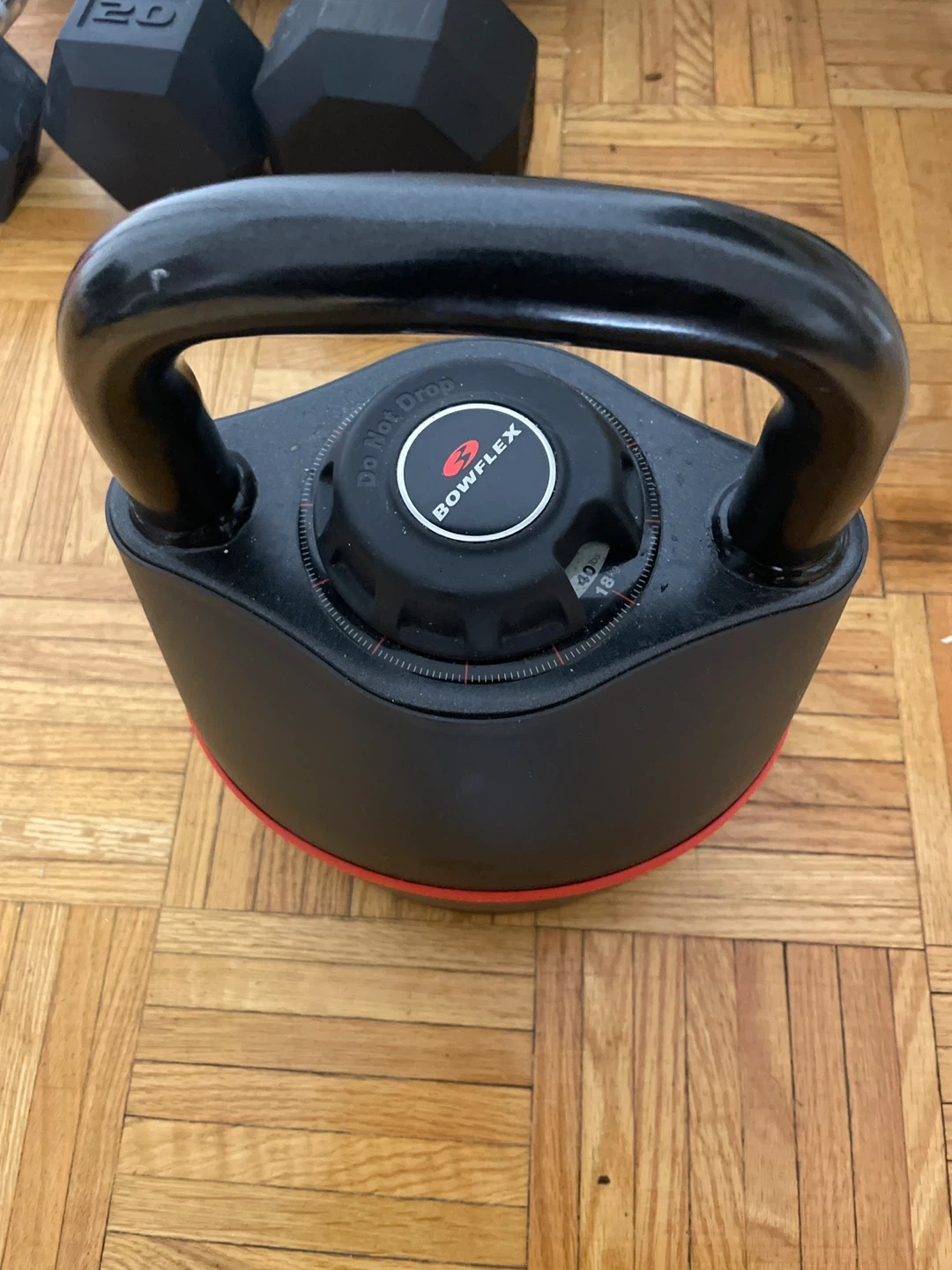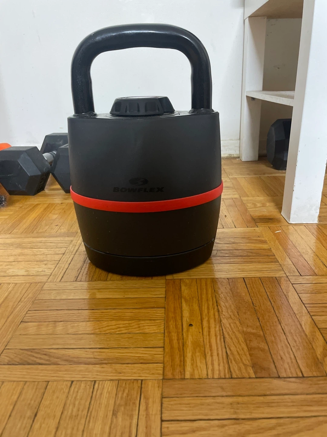 This is a Bowflex SelectTech 840 kettlebell. It adjusts from 18 to 80 lbs with a turn of a dial. Ideal for strength training and various exercises.