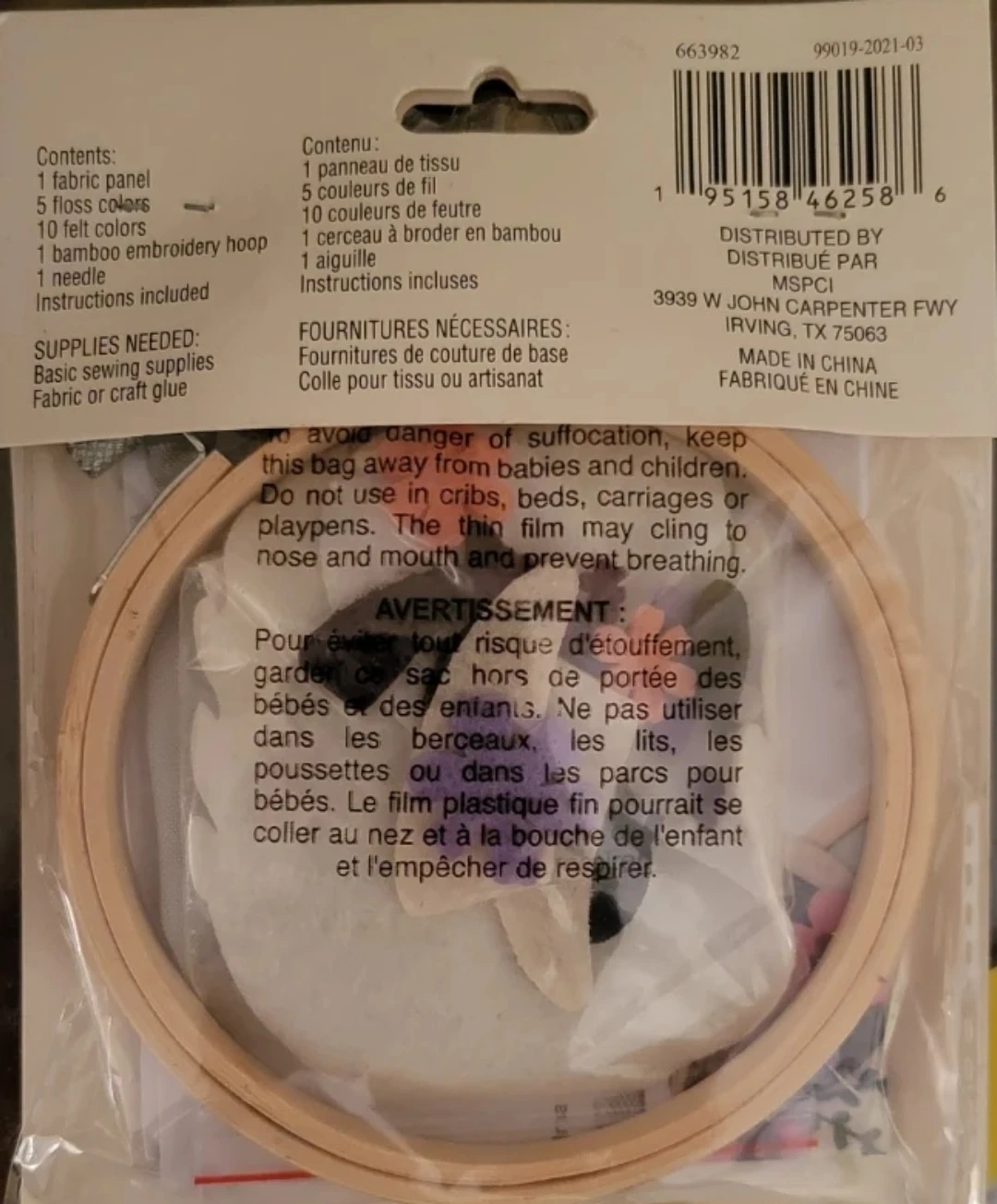 This is a new Loops & Threads felt hoop kit for creating a llama design. It includes 1 fabric panel, 5 floss colours, 10 felt colours, a bamboo embroidery hoop, and a needle. The finished size is 4 inches (10.1 cm) round. This kit is great for craft enthusiasts looking for a fun project!