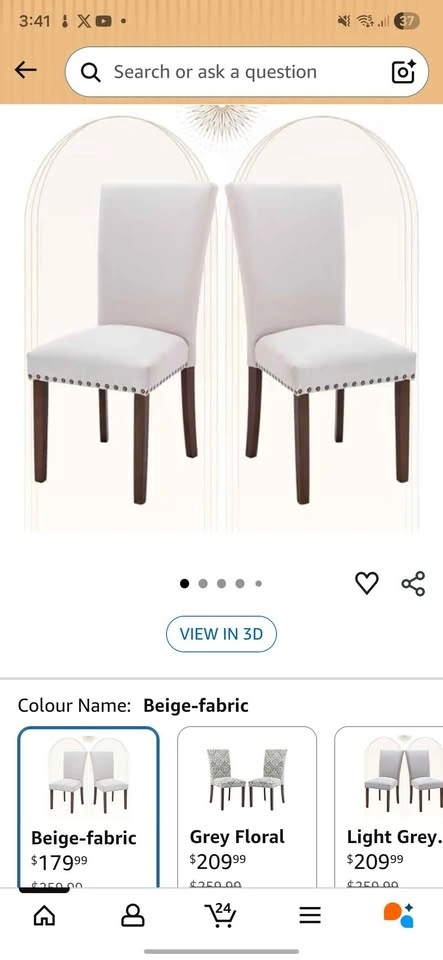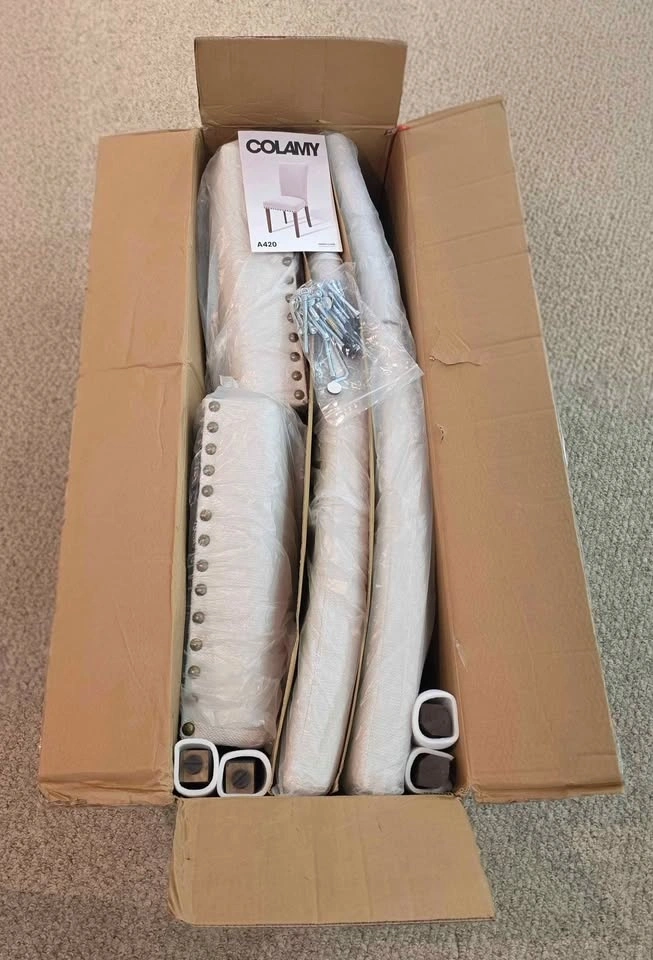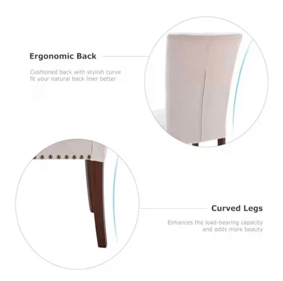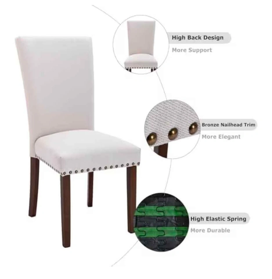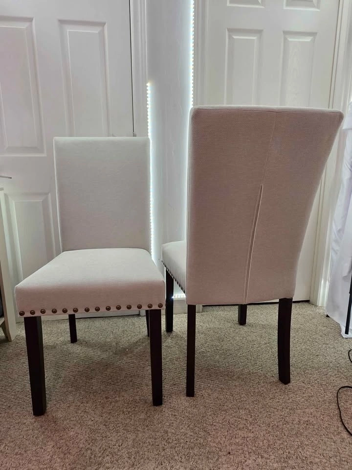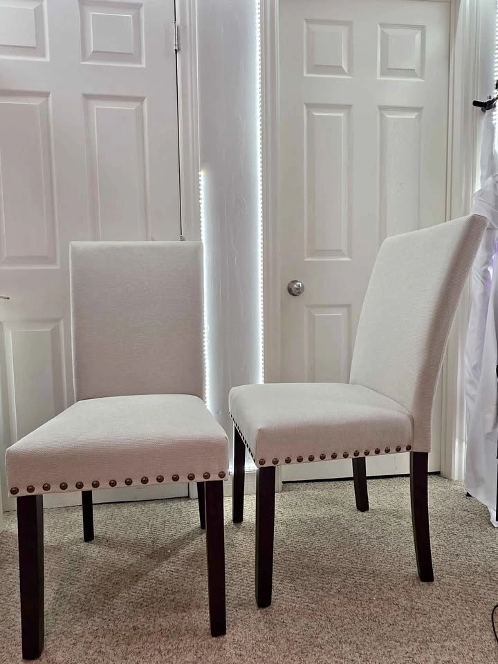 Stylish COLAMY A420 dining chairs, a set of 2. Upholstered in beige fabric with cool nailhead trim. Has dark wood legs. One set is still new in the box, unopened.