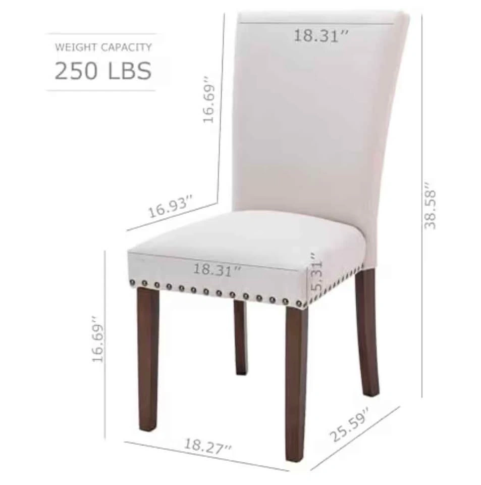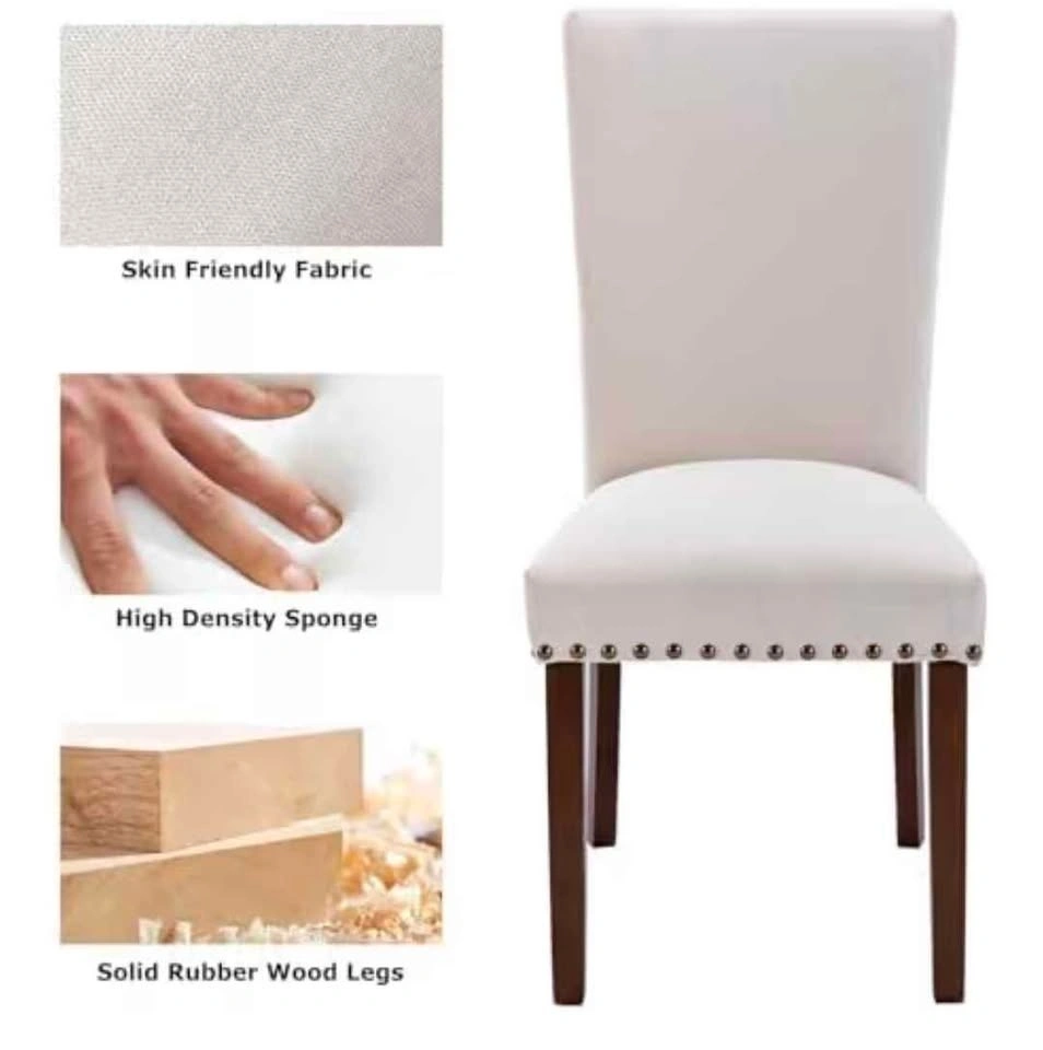 Stylish COLAMY A420 dining chairs, a set of 2. Upholstered in beige fabric with cool nailhead trim. Has dark wood legs. One set is still new in the box, unopened.