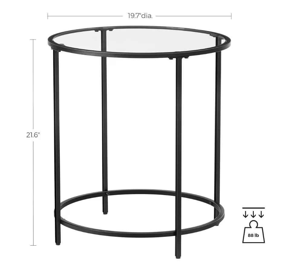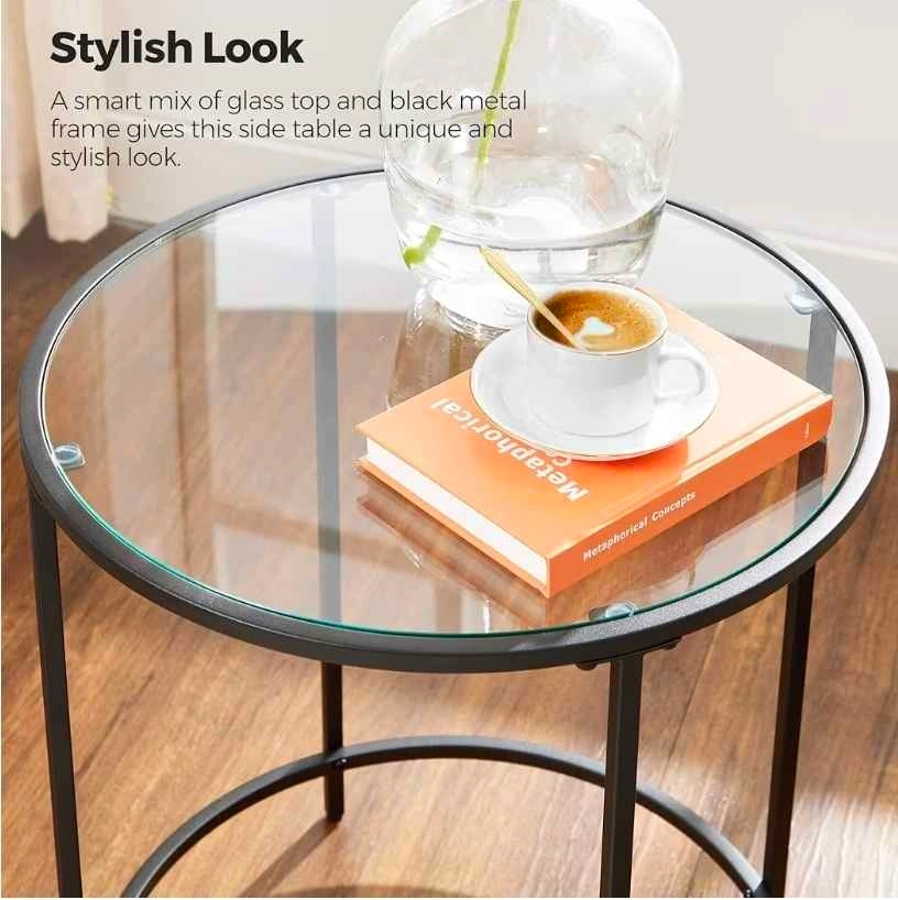 VASAGLE LGT020 round side table. Black metal frame with clear glass top. Includes instructions and hardware for assembly.