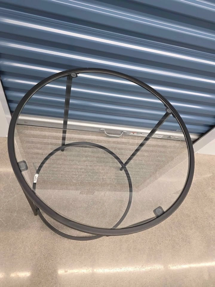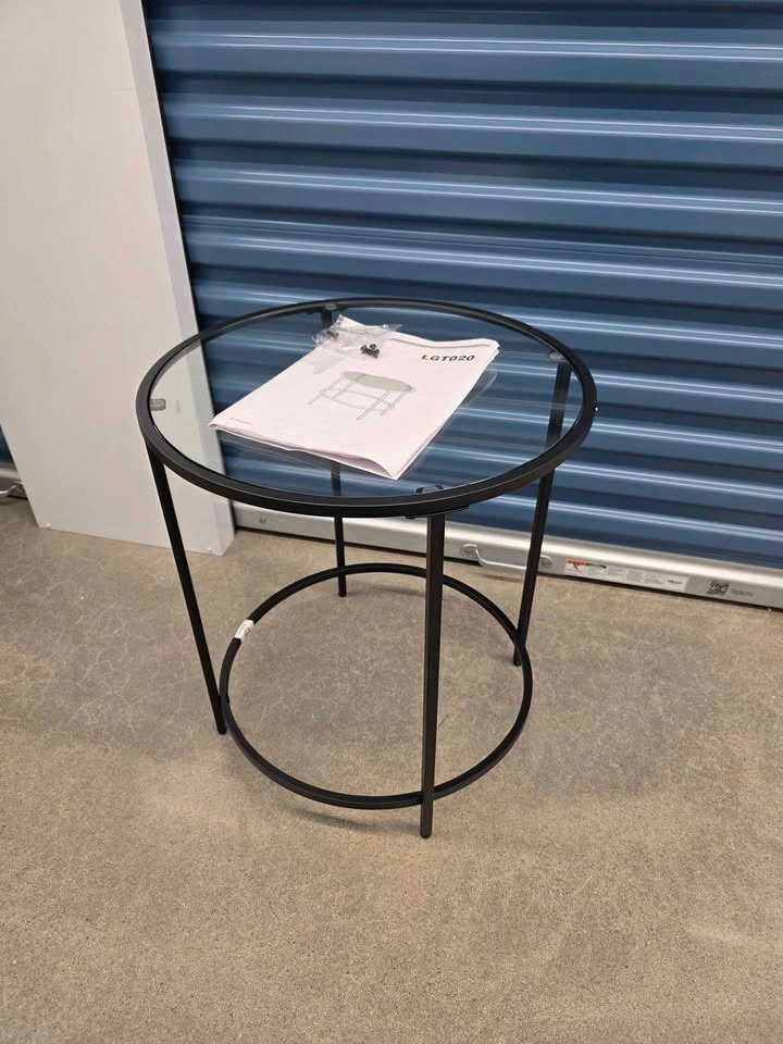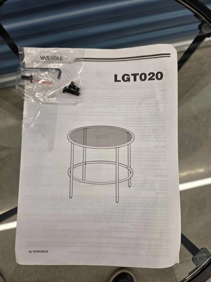VASAGLE LGT020 round side table. Black metal frame with clear glass top. Includes instructions and hardware for assembly.