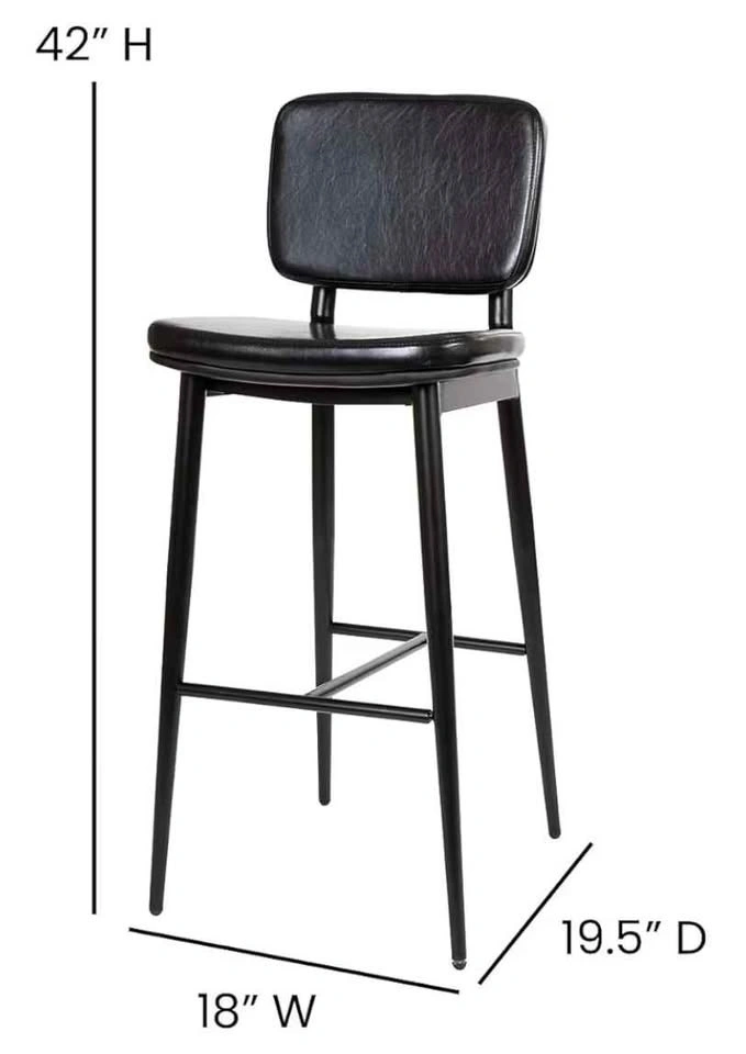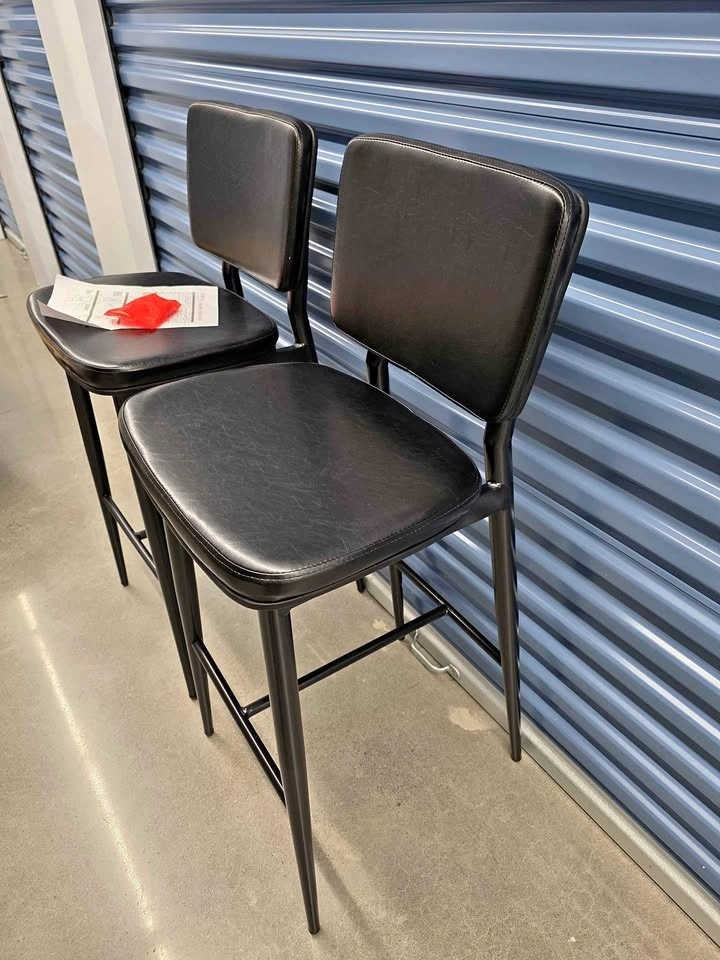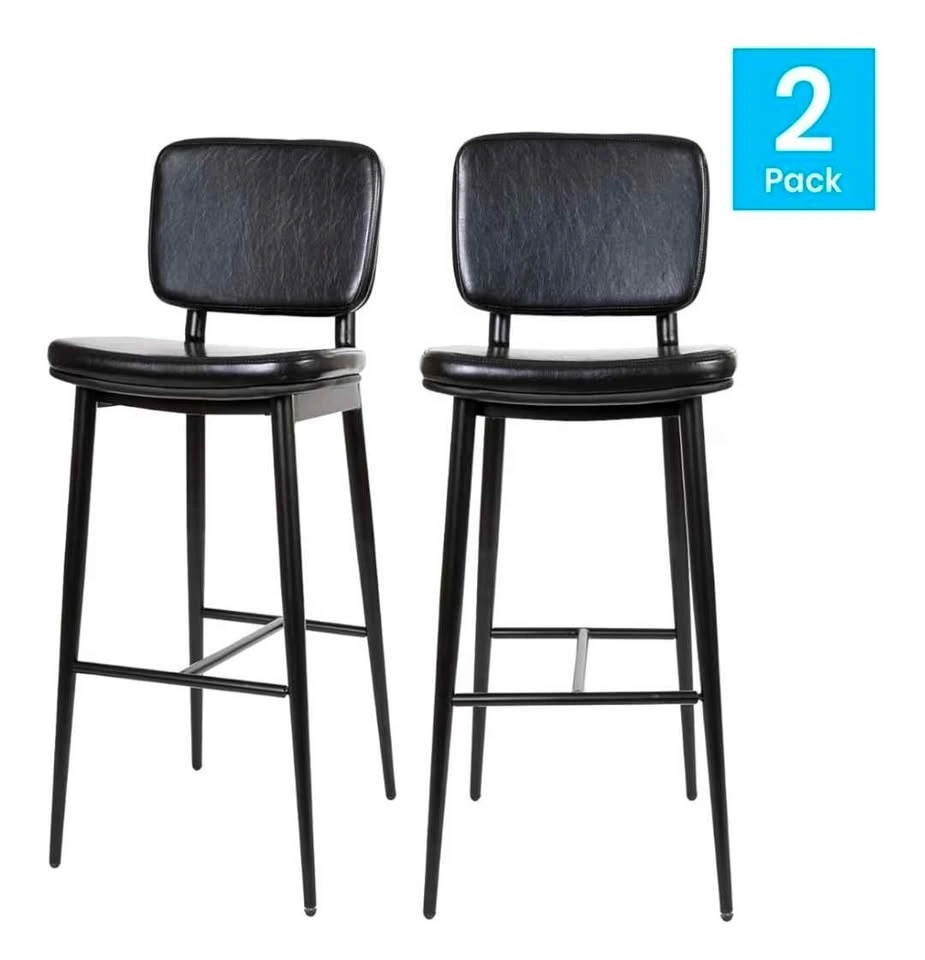 This set of two black bar stools features black faux leather seats and backrests, complemented by durable black metal frames. The dimensions of each stool are 42 inches in height, 18 inches in width, and 19.5 inches in depth. Feel free to message if you have any questions!