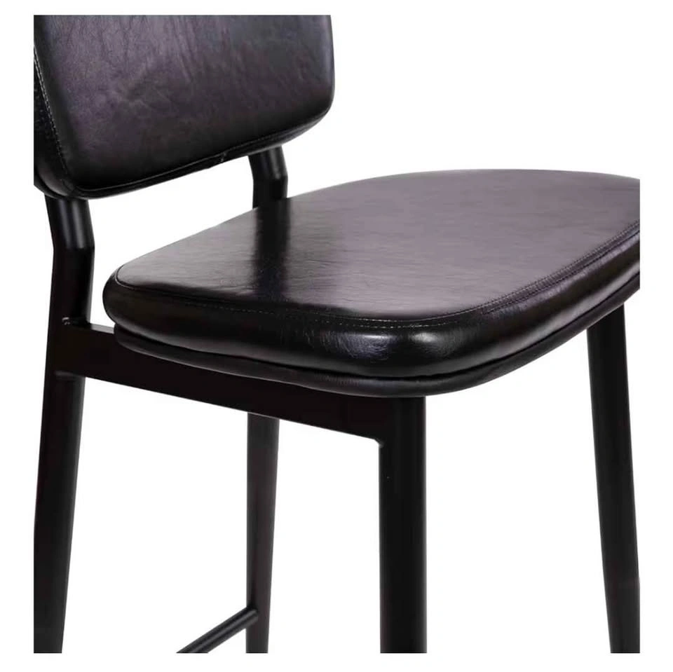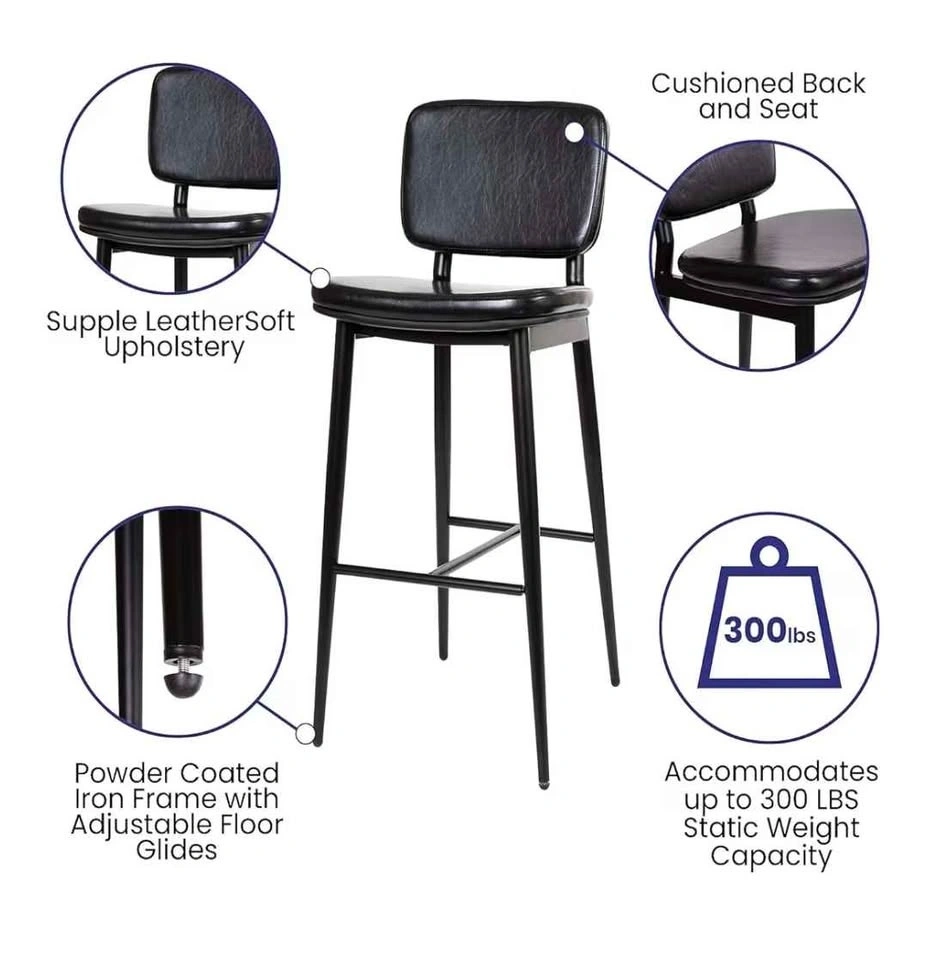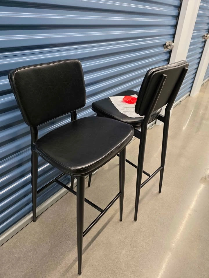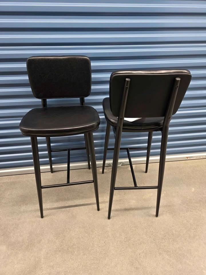 This set of two black bar stools features black faux leather seats and backrests, complemented by durable black metal frames. The dimensions of each stool are 42 inches in height, 18 inches in width, and 19.5 inches in depth. Feel free to message if you have any questions!