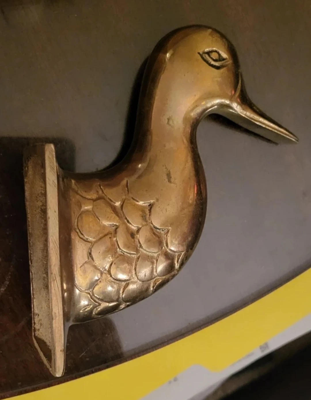 Vintage brass coat hook shaped like a duck. It's made of solid brass with a detailed design. This would make a charming addition to any decor!