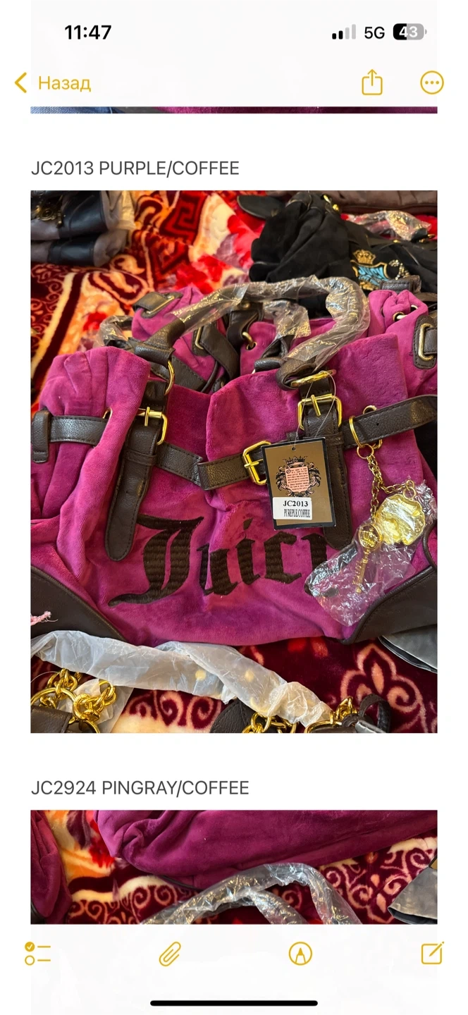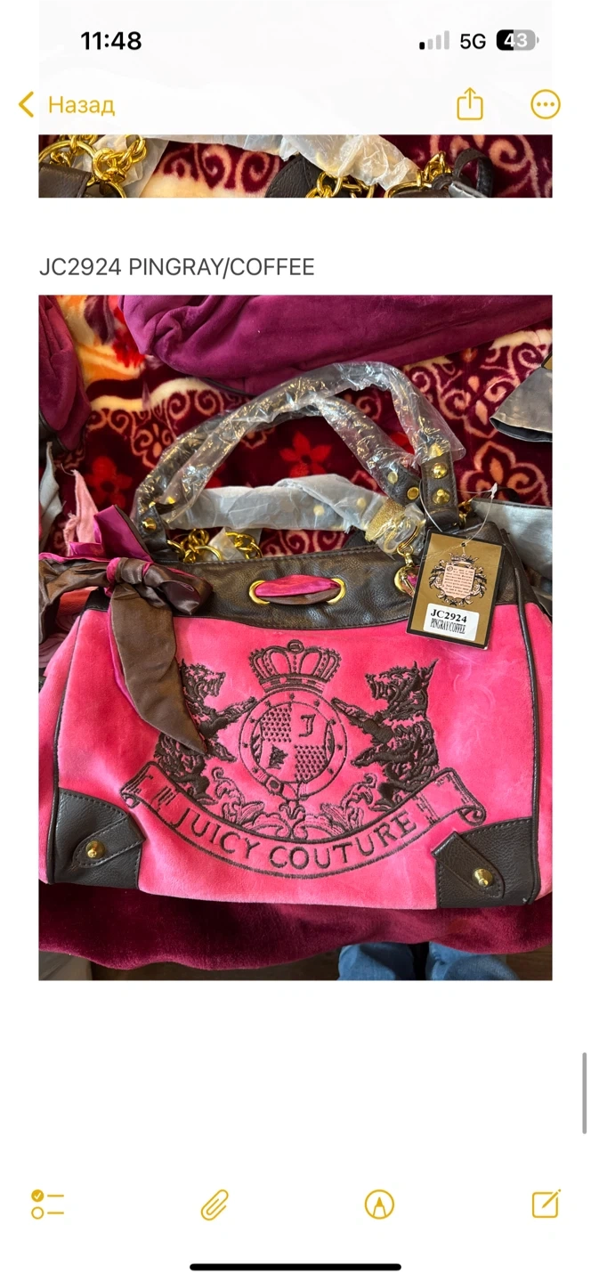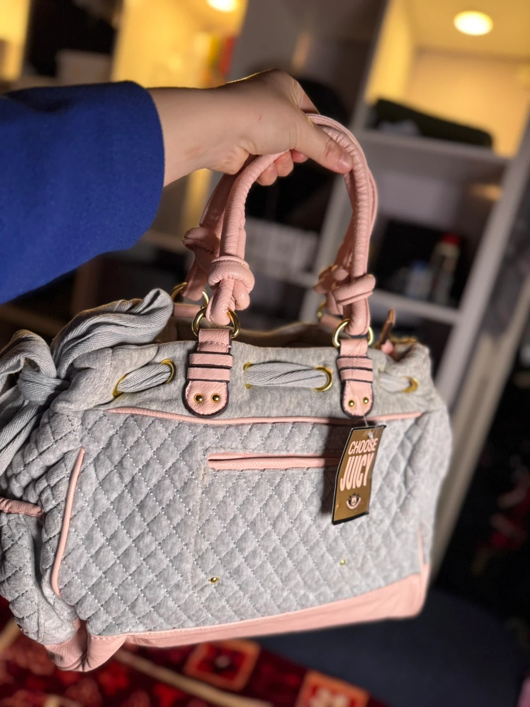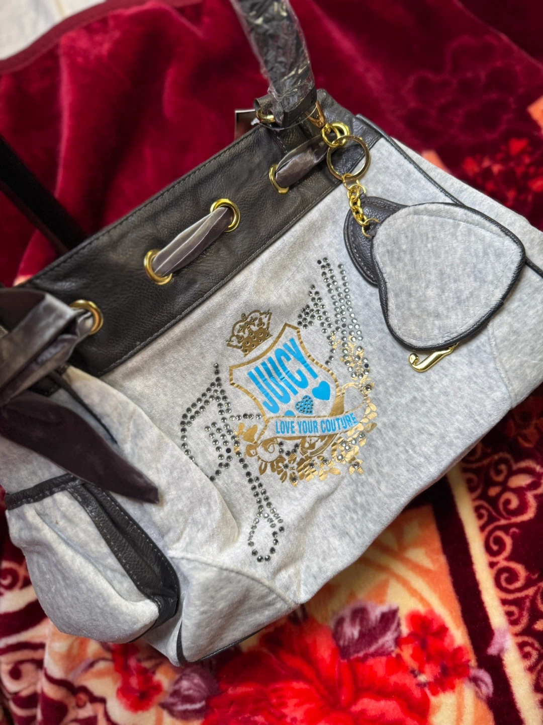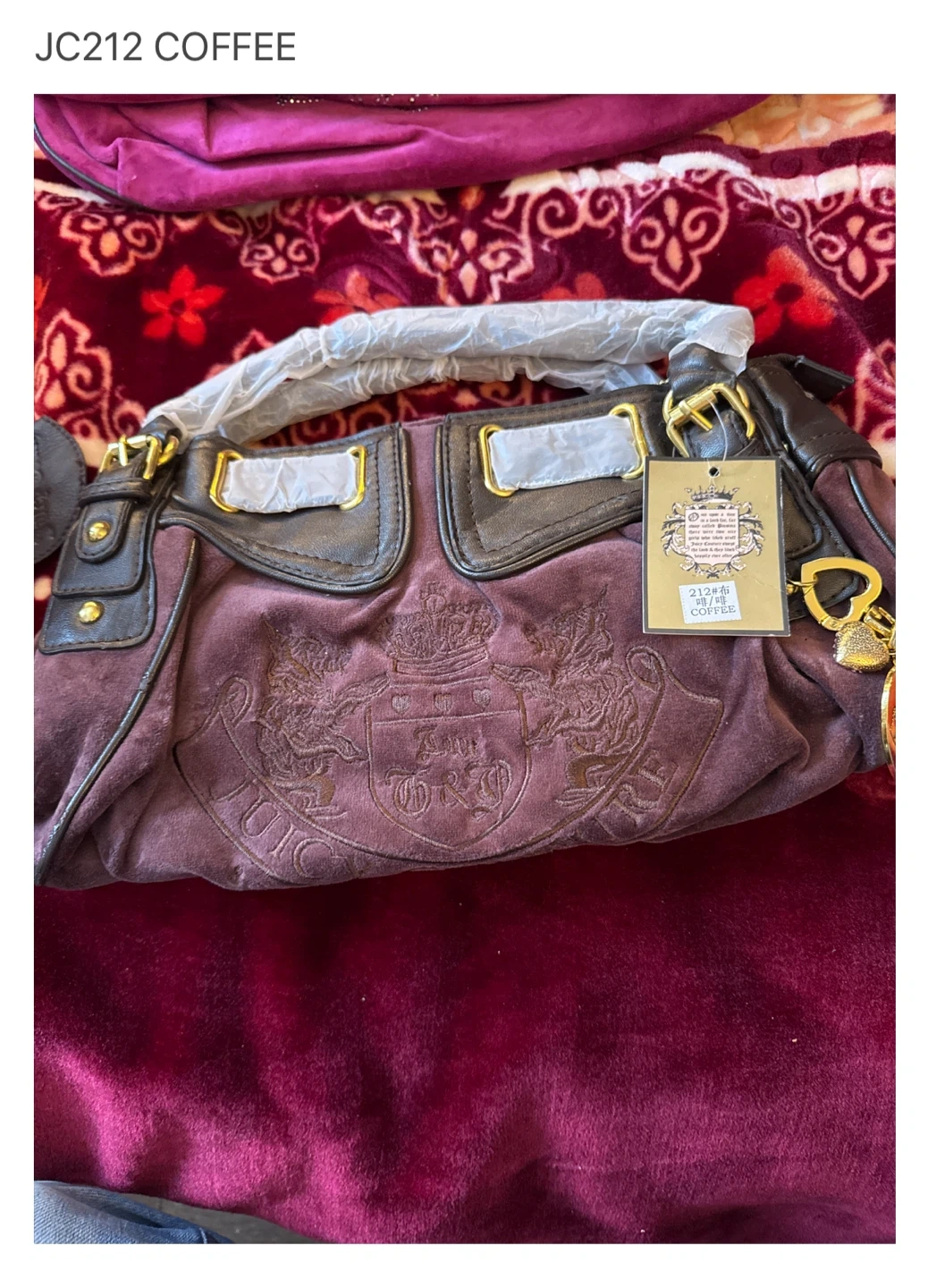 This is a Juicy Couture velour shoulder bag in a vibrant pink colour. It features gold-tone hardware and the signature crest logo. It's a stylish accessory for everyday use!