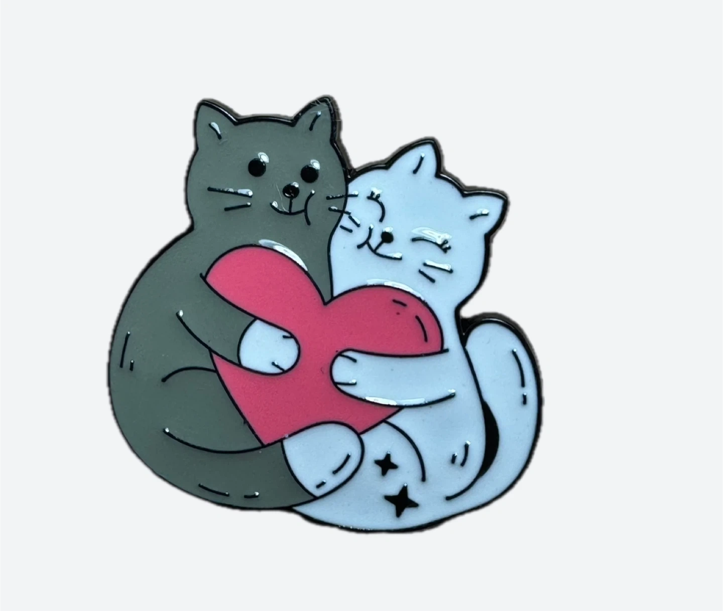Adorable enamel pin featuring two cats hugging a pink heart. 🩷