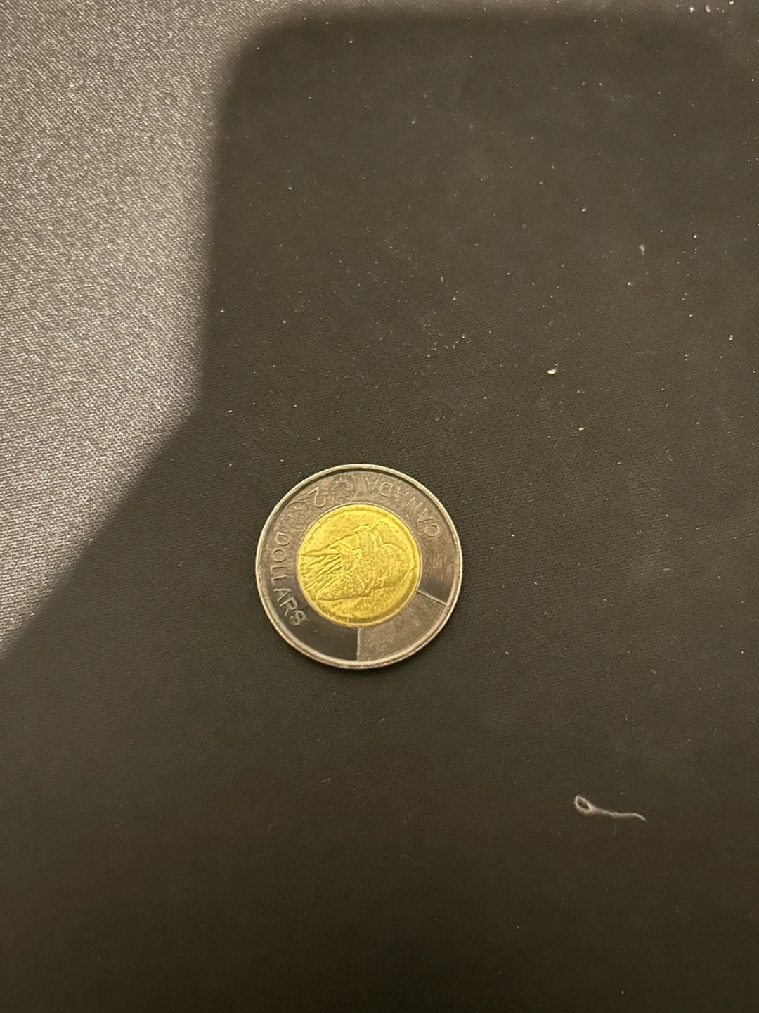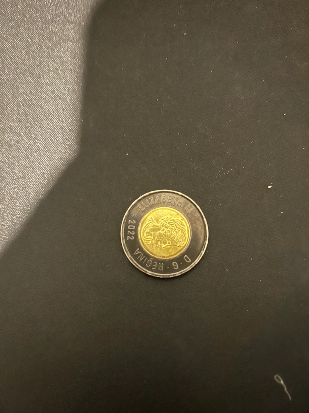 This is a 2022 Canadian 2 dollar coin featuring a tribute to Queen Elizabeth II. It's in mint state condition. The coin is bimetallic, with a golden-coloured inner core and a silver-coloured outer ring.