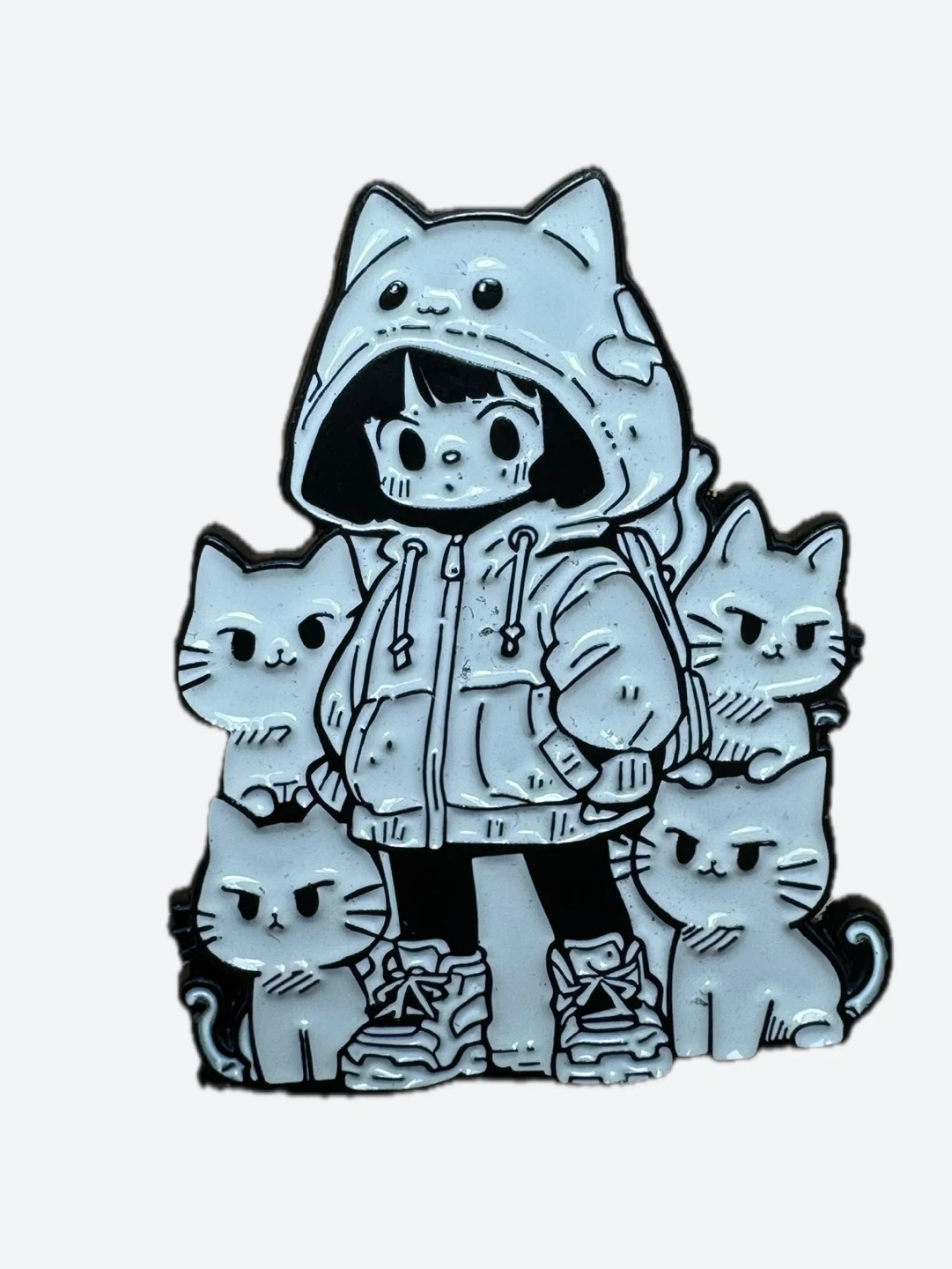 Cool enamel pin featuring a girl in a cat-ear hoodie surrounded by cats.