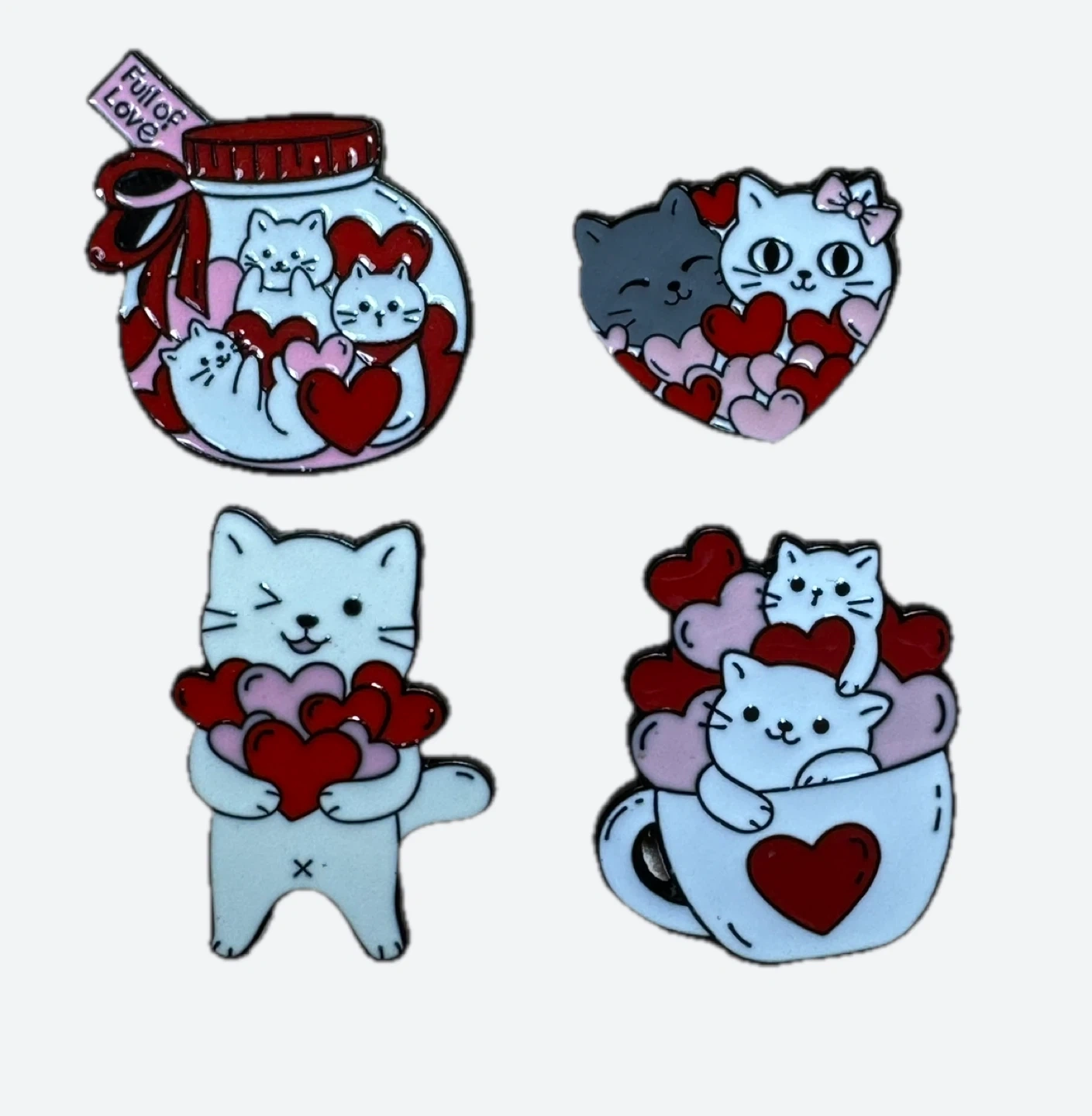 Four adorable enamel pins featuring cute cats with hearts.