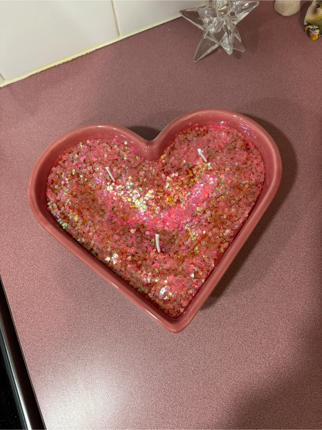 A decorative pink candle shaped like a heart, filled with glitter. It has three wicks for burning. Adds a lovely touch to any room!