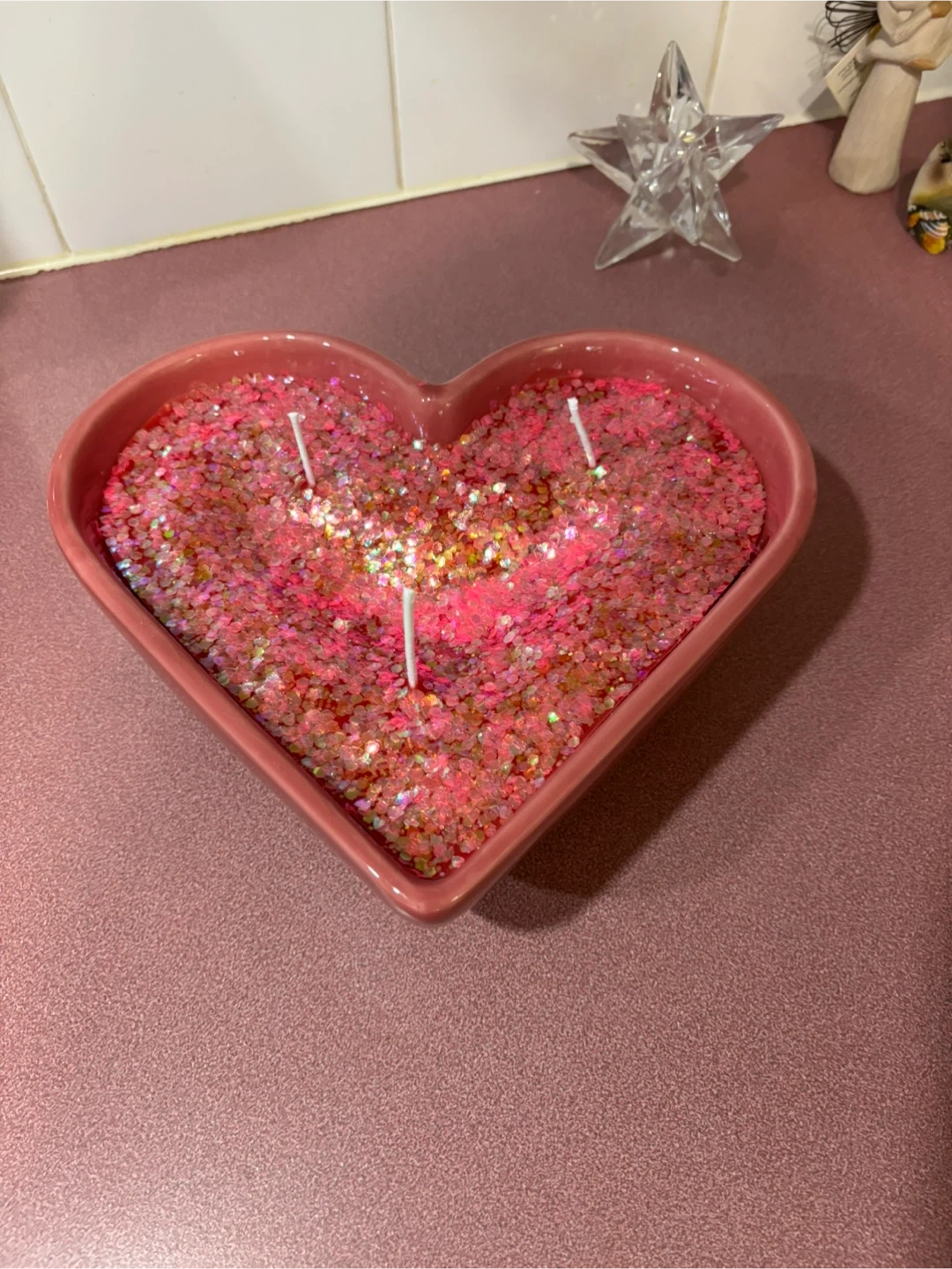 A decorative pink candle shaped like a heart, filled with glitter. It has three wicks for burning. Adds a lovely touch to any room!
