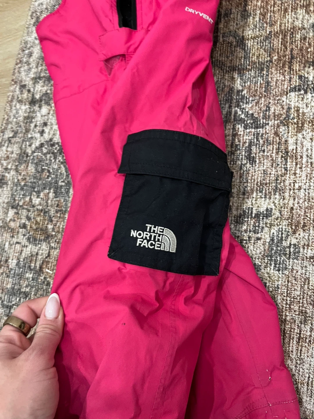 This is The North Face toddler ski suit in a bright pink colour. It's a size 5/5 and features DryVent technology. The suit has an adjustable waist, leg gaiter, and reinforced areas. It's designed for cold weather adventures!