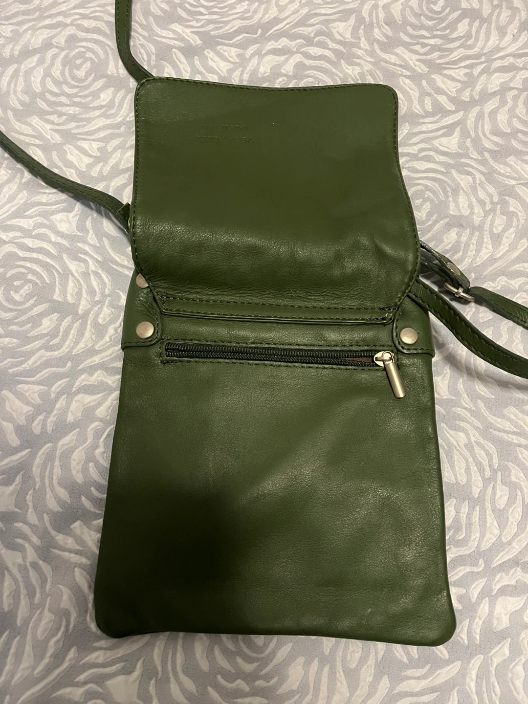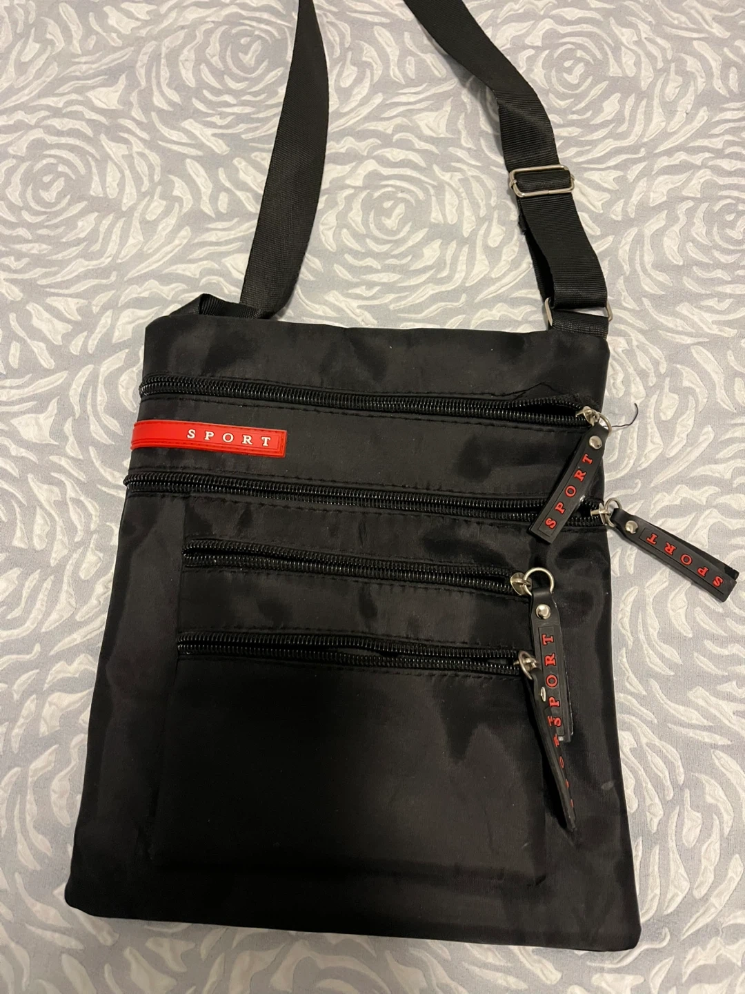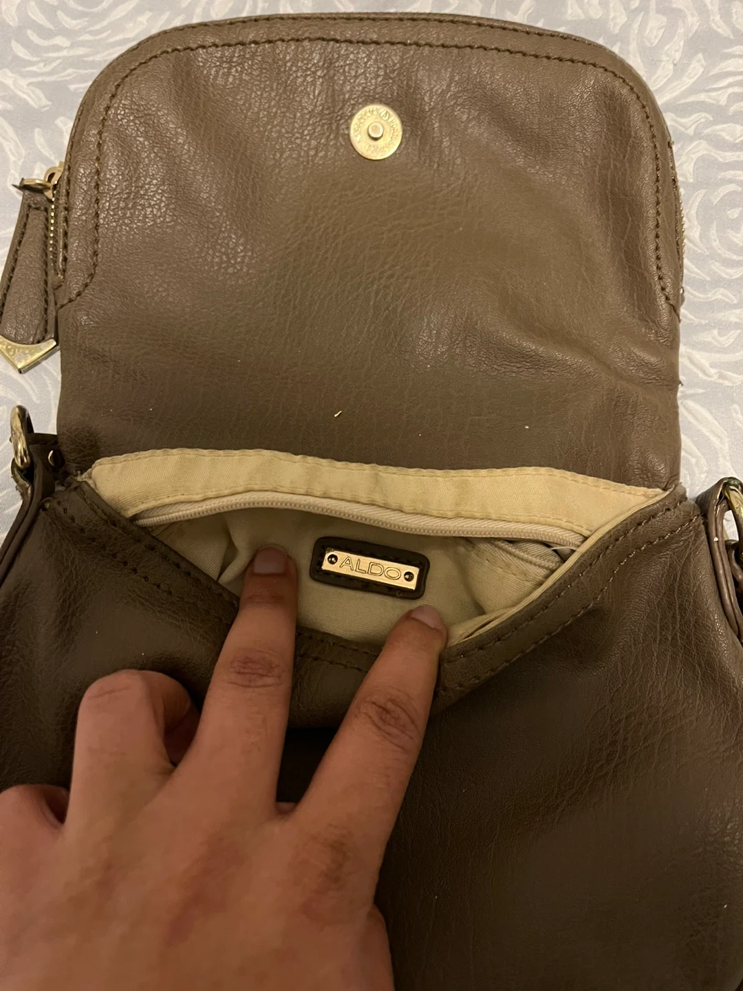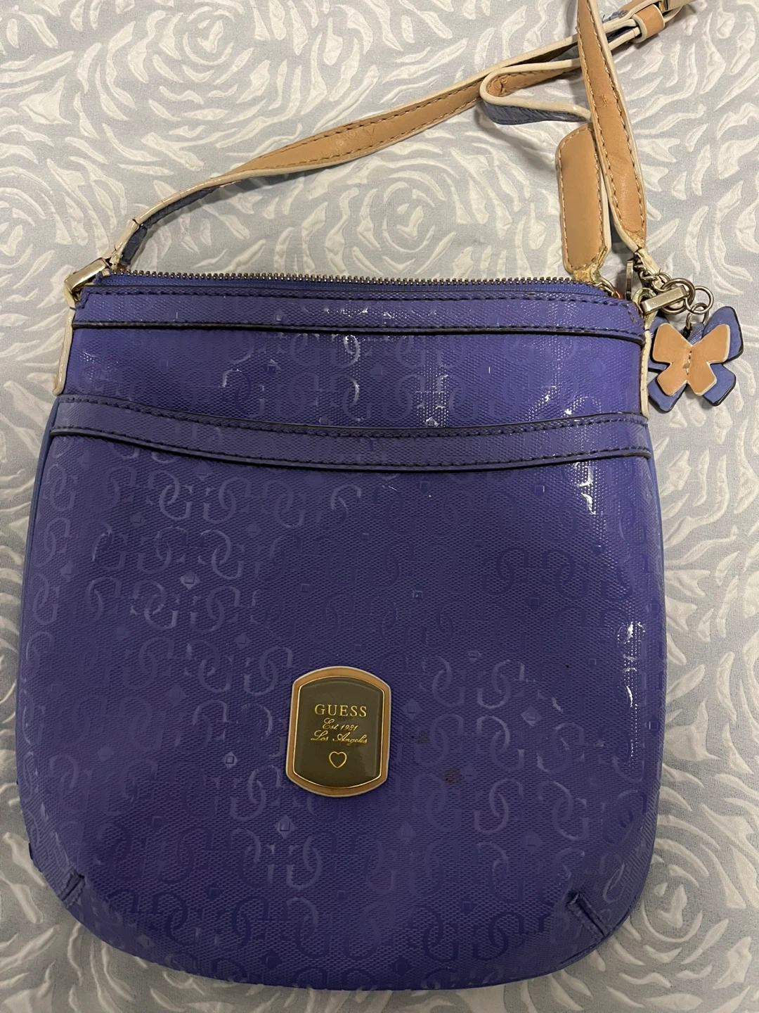 A stylish Guess crossbody bag in a vibrant purple colour. Brown Aldo crossbody bag. Black sports bag with plenty of zippers and green leather crossbody bag. $10/each