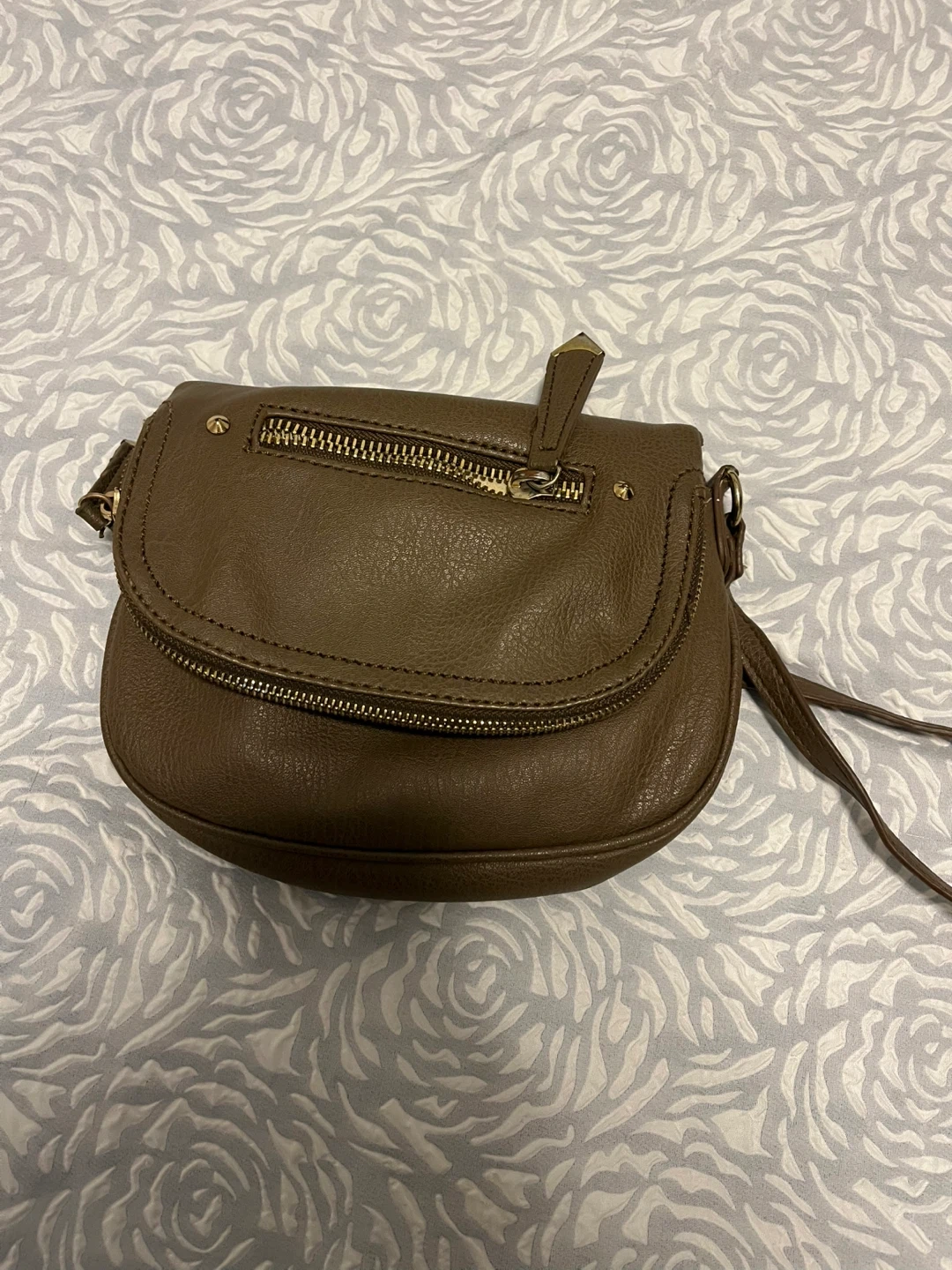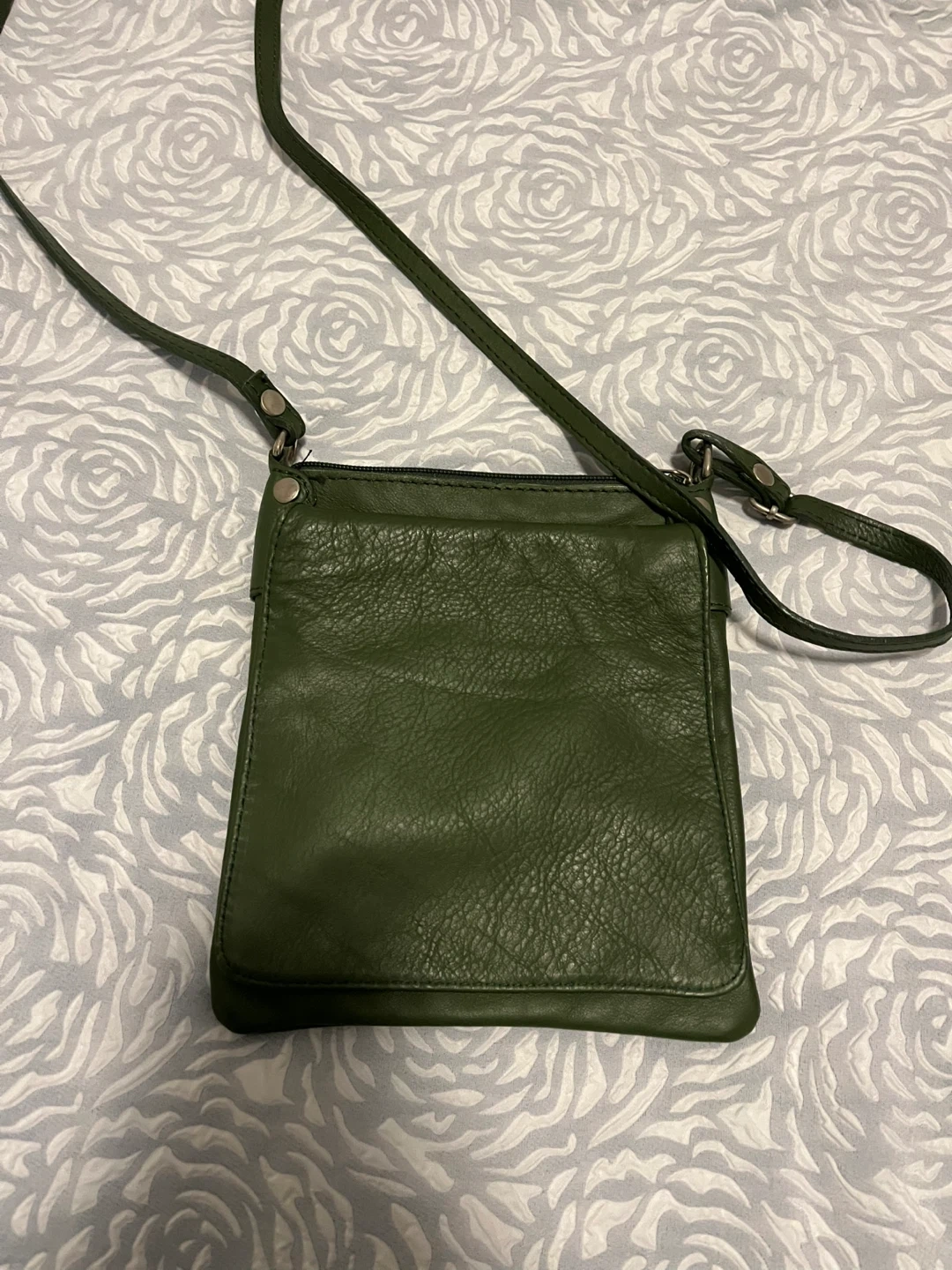 A stylish Guess crossbody bag in a vibrant purple colour. Brown Aldo crossbody bag. Black sports bag with plenty of zippers and green leather crossbody bag. $10/each