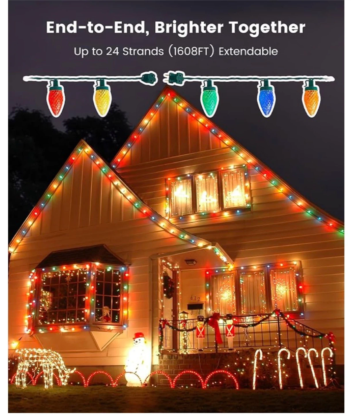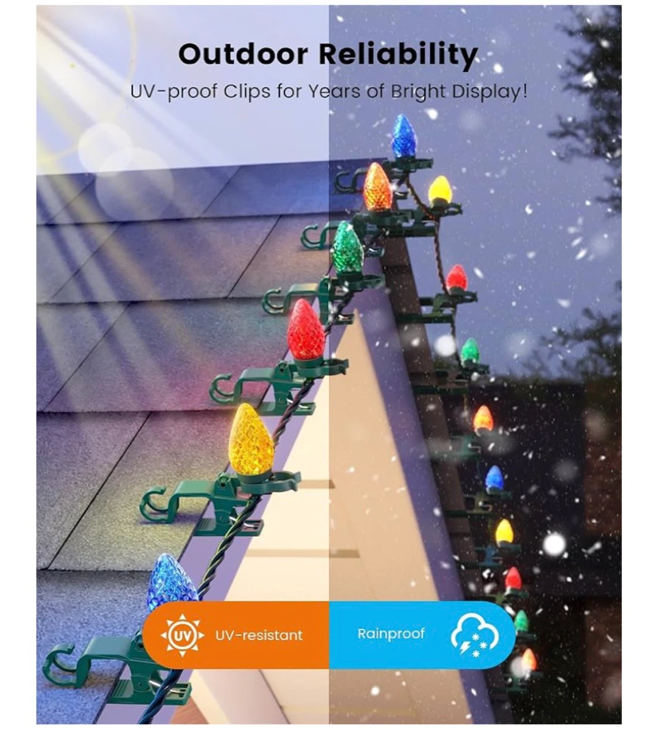 These C9 LED Christmas lights come in a 67-foot strand with 100 bulbs and 100 spring clips. They are UV-resistant and rainproof for outdoor reliability. They're easy to clip and remove, and can be extended up to 24 strands. These lights are great for decorating houses during the holidays!