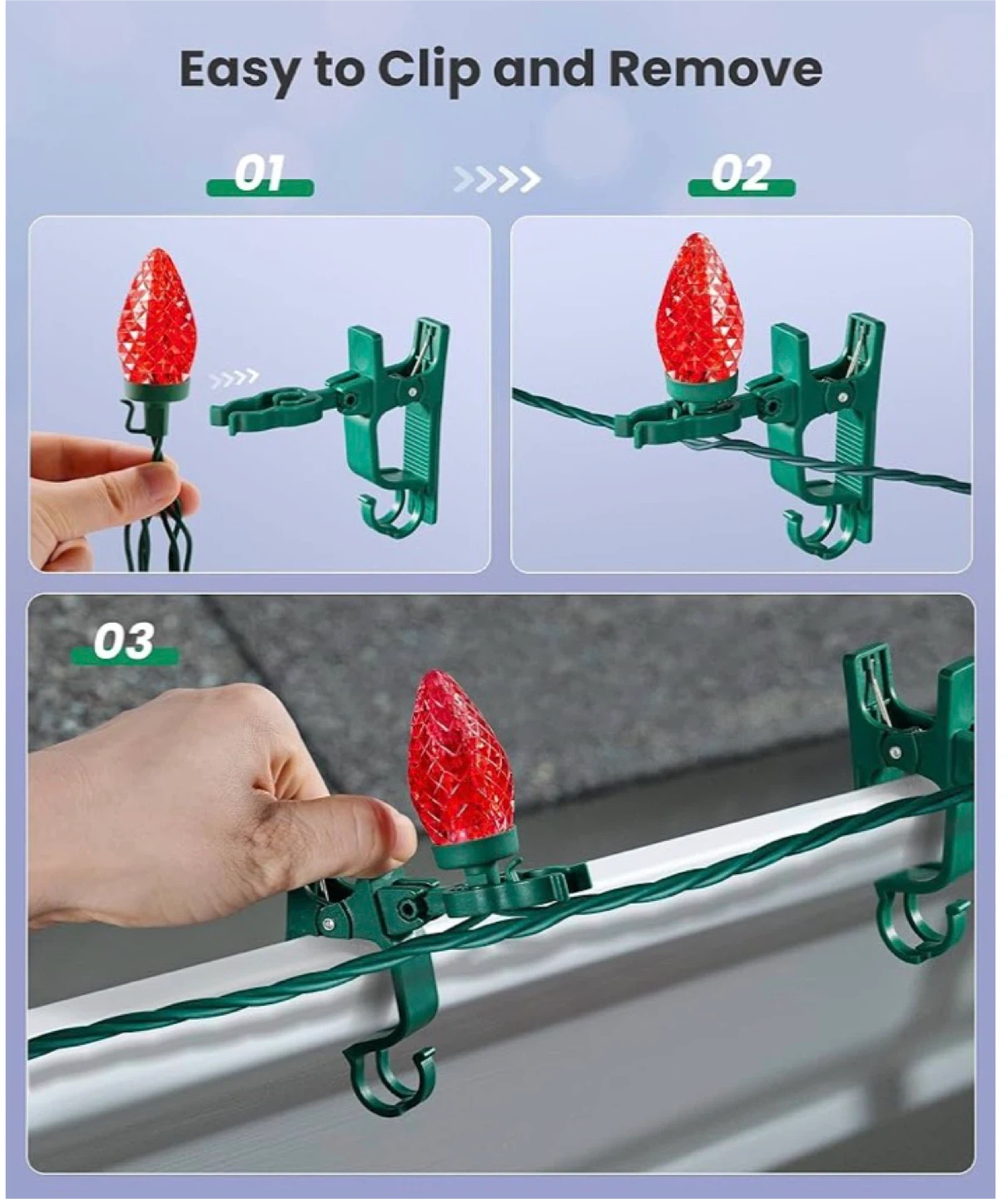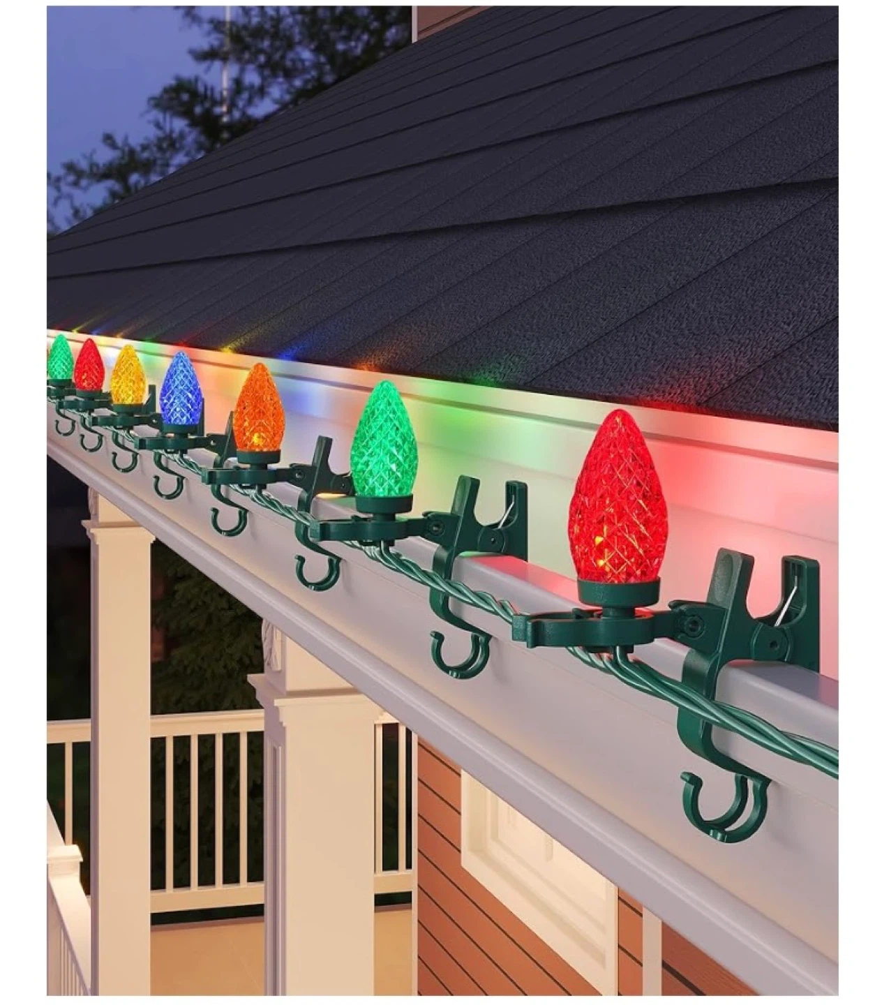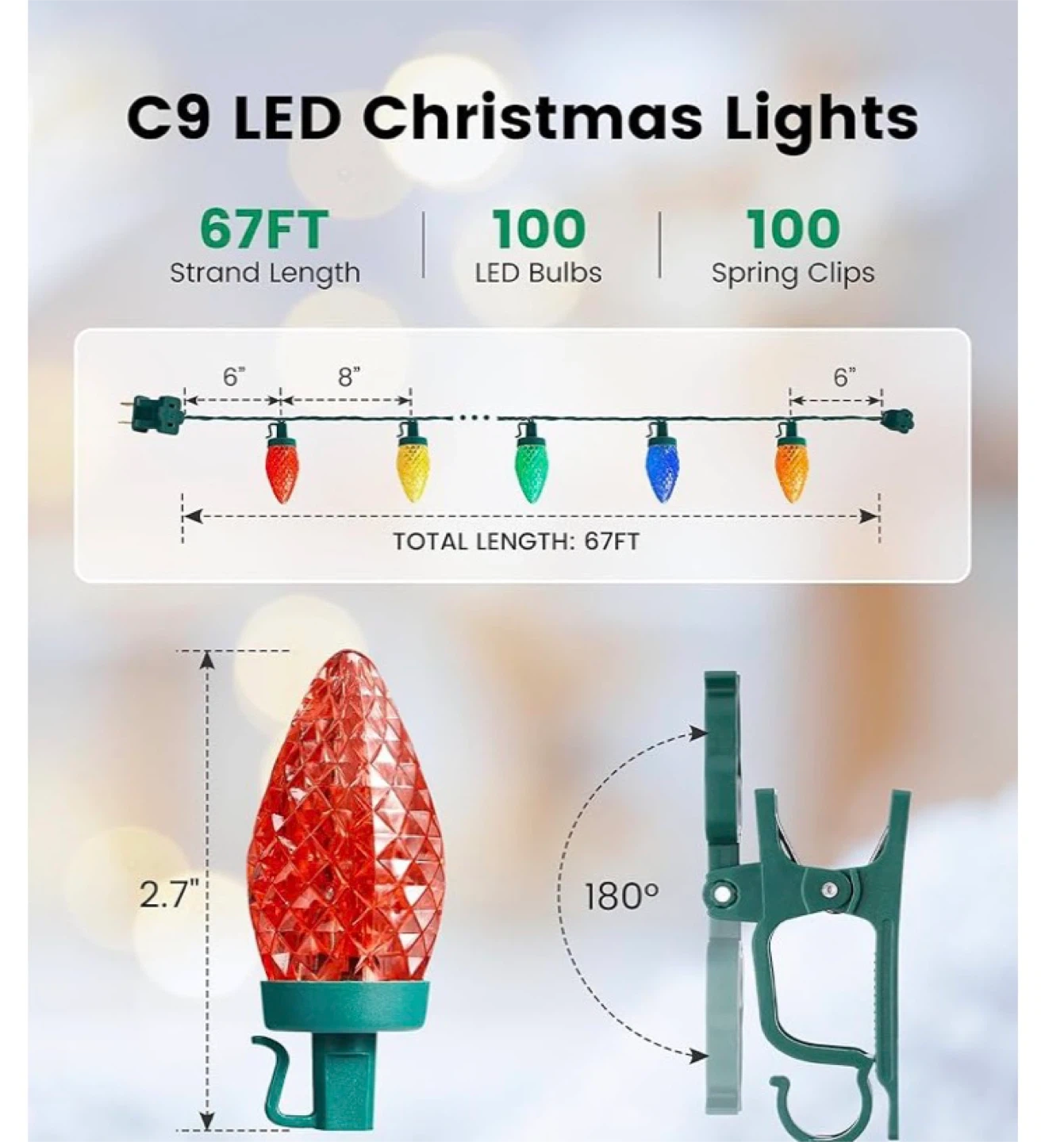 These C9 LED Christmas lights come in a 67-foot strand with 100 bulbs and 100 spring clips. They are UV-resistant and rainproof for outdoor reliability. They're easy to clip and remove, and can be extended up to 24 strands. These lights are great for decorating houses during the holidays!
