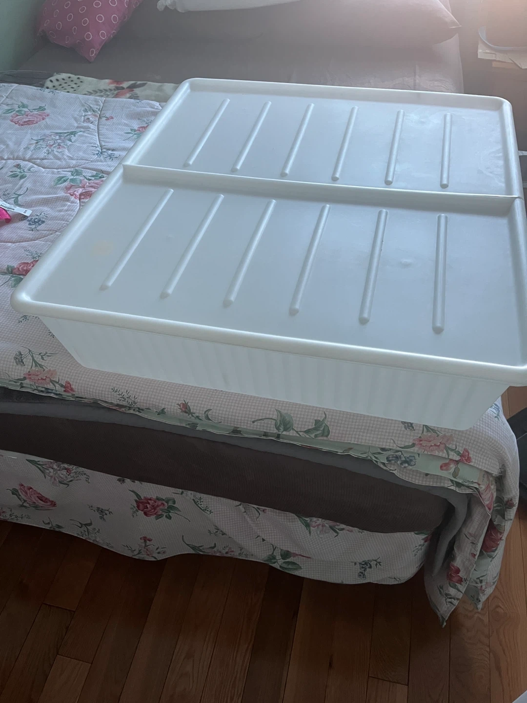 It's a large, white plastic storage bin with a black lid. This bin is great for organizing items in your home or garage. Plastic material.