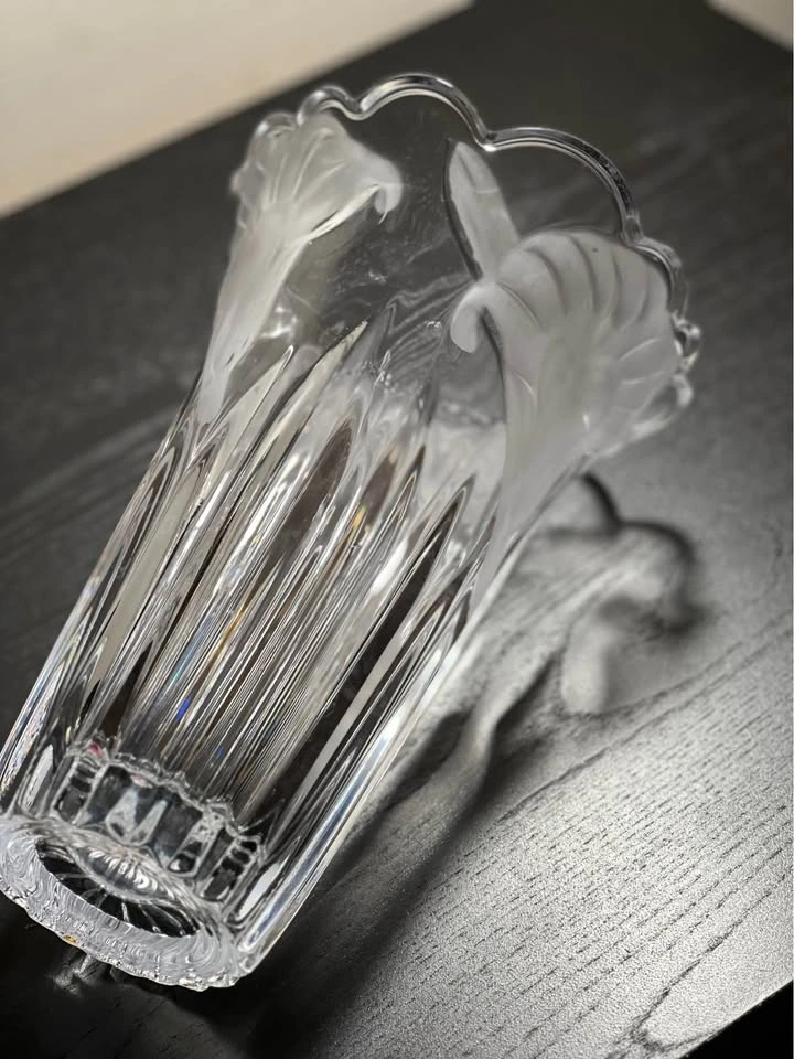 This is a Mikasa Studio Nova crystal vase in the "Wild Lily" or "Satin Lilies" pattern. It features a clear, heavy crystal design with a vertically ribbed, fluted base and an acid-etched, frosted floral pattern near the flared, scalloped rim. Brand: Mikasa (Studio Nova line). Pattern: Wild Lily / Satin Lillies. Material: Crystal. Origin: Japan (late 20th century). Approximate Height: 9.75 inches tall. Preowned - small defects as shown in images. Sold as is. Pickup is 58th and 7th Ave in midtown Manhattan.