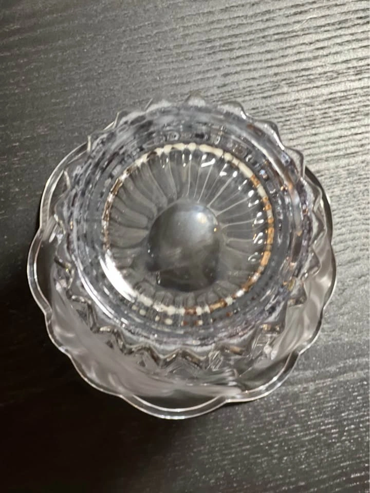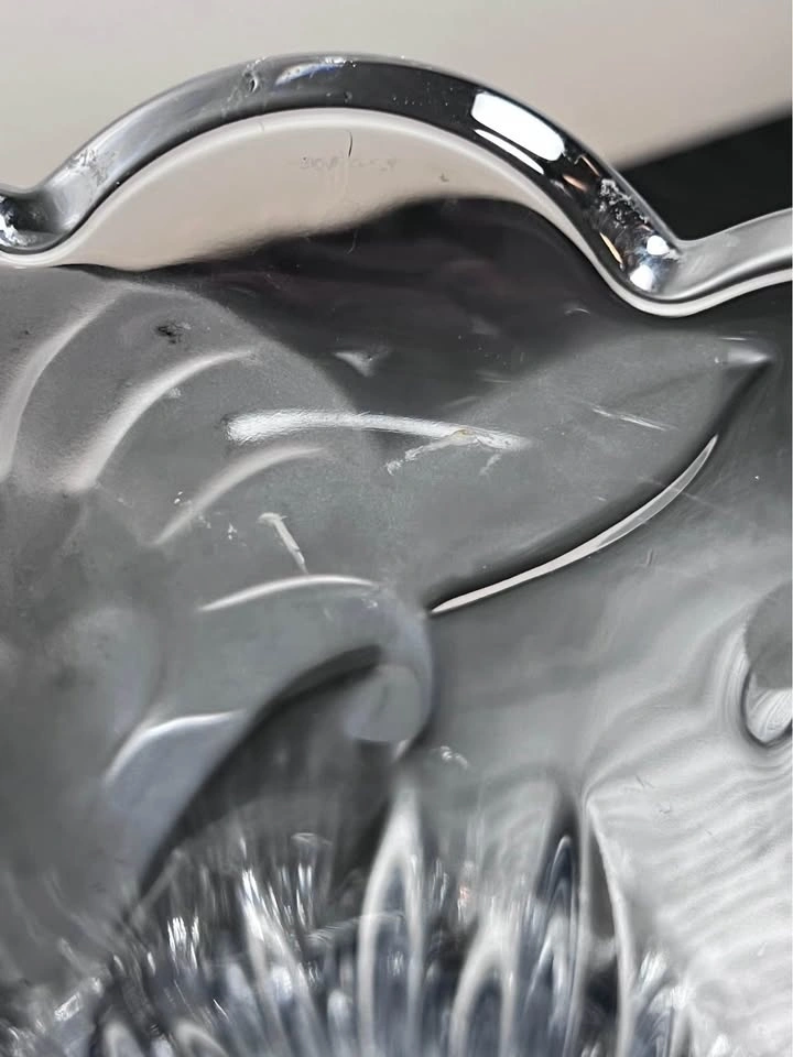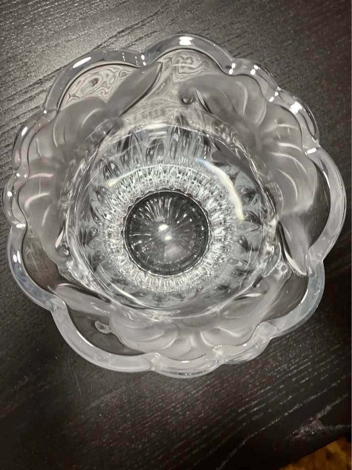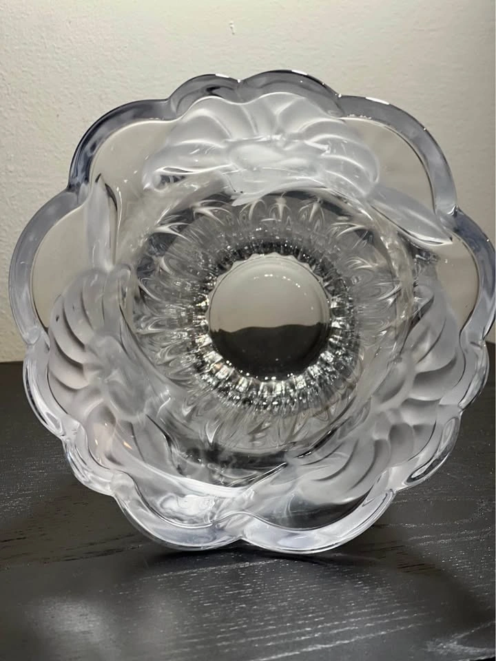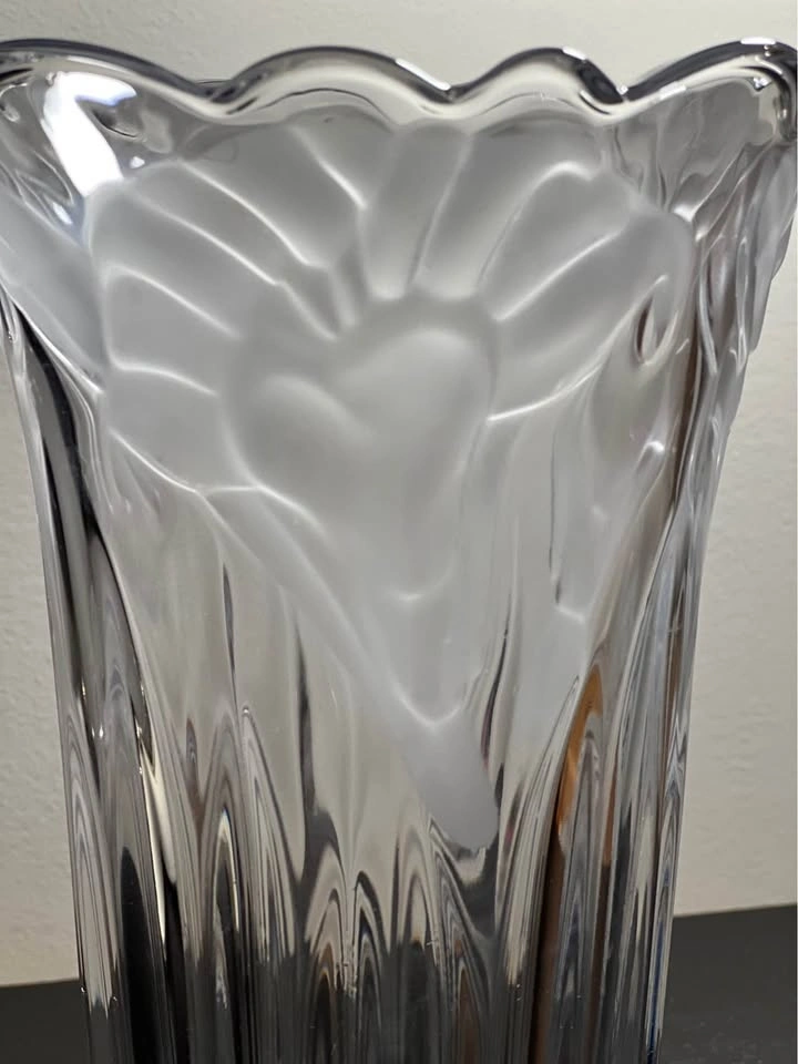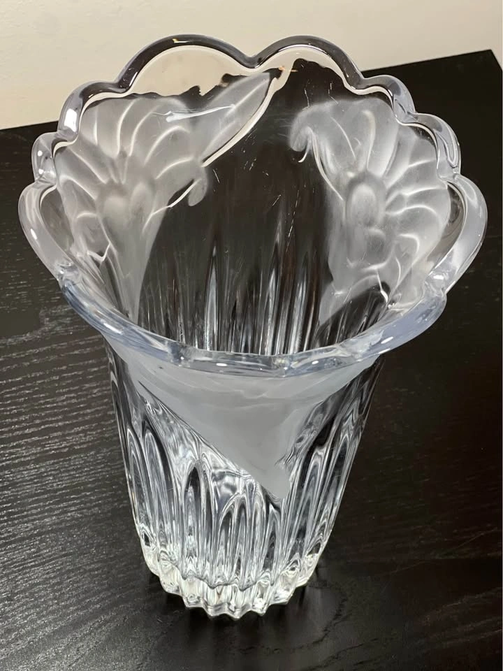 This is a Mikasa Studio Nova crystal vase in the "Wild Lily" or "Satin Lilies" pattern. It features a clear, heavy crystal design with a vertically ribbed, fluted base and an acid-etched, frosted floral pattern near the flared, scalloped rim. Brand: Mikasa (Studio Nova line). Pattern: Wild Lily / Satin Lillies. Material: Crystal. Origin: Japan (late 20th century). Approximate Height: 9.75 inches tall. Preowned - small defects as shown in images. Sold as is. Pickup is 58th and 7th Ave in midtown Manhattan.