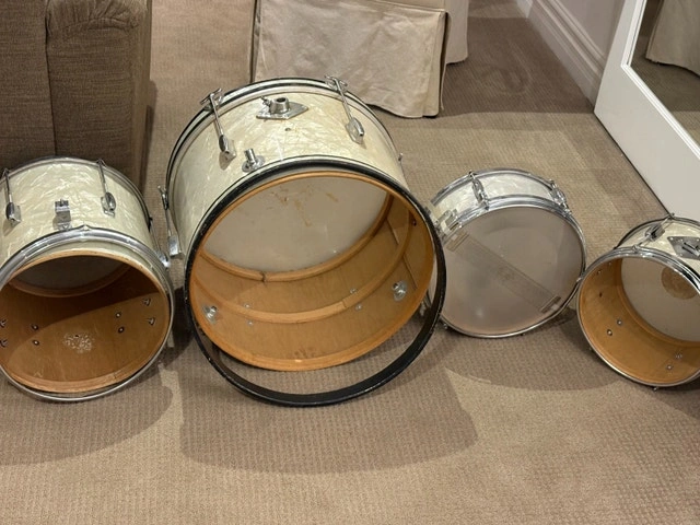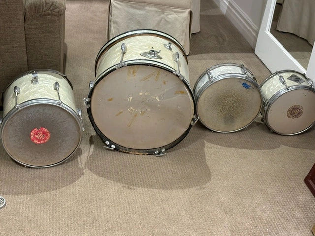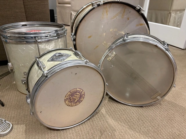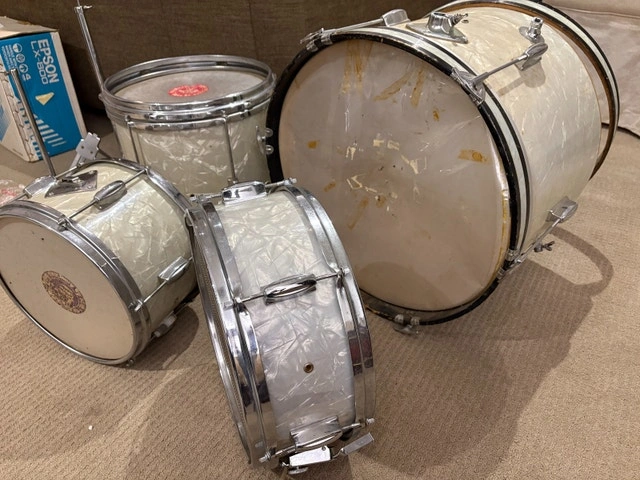 Vintage 1960s Japanese export drum kit in white pearl wrap. Complete set including bass drum, rack tom, floor tom, matching snare, and original Japanese bass drum pedal. These are true vintage shells with original hardware and classic warm tone once re-headed. All drums are structurally solid. Snare strainer and original snare wires are present. Pedal is included and marked “Japan.” Condition reflects age: Heads are old and should be replaced. Some cosmetic wear, light staining, and chrome pitting. No major cracks or shell damage. Great candidate for: Vintage restoration, Indie / garage / lo-fi recording kit, Practice or rehearsal space, Cool mid-century decor. Selling as-is. No cymbals or stands included beyond what’s pictured. $400 OBO. Cash accepted.
