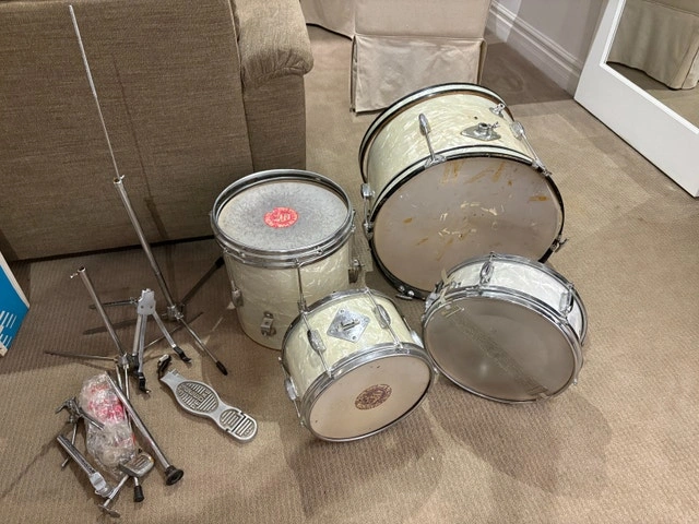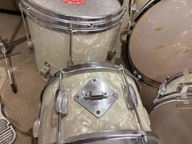 Vintage 1960s Japanese export drum kit in white pearl wrap. Complete set including bass drum, rack tom, floor tom, matching snare, and original Japanese bass drum pedal. These are true vintage shells with original hardware and classic warm tone once re-headed. All drums are structurally solid. Snare strainer and original snare wires are present. Pedal is included and marked “Japan.” Condition reflects age: Heads are old and should be replaced. Some cosmetic wear, light staining, and chrome pitting. No major cracks or shell damage. Great candidate for: Vintage restoration, Indie / garage / lo-fi recording kit, Practice or rehearsal space, Cool mid-century decor. Selling as-is. No cymbals or stands included beyond what’s pictured. $400 OBO. Cash accepted.