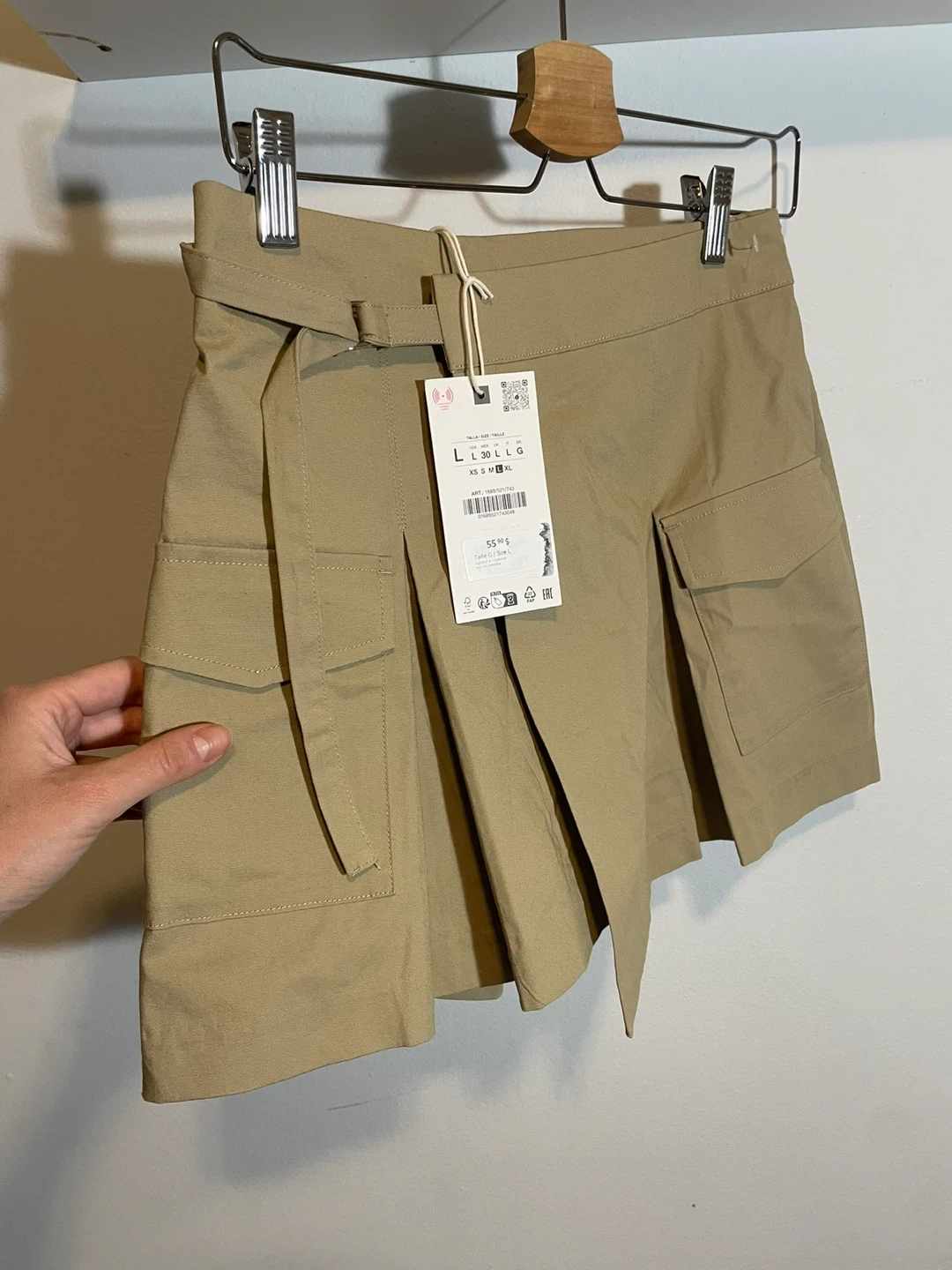 Tan cargo skort with a tie belt. Features multiple pockets and a pleated detail. Made from a cotton blend. It's great for everyday wear!