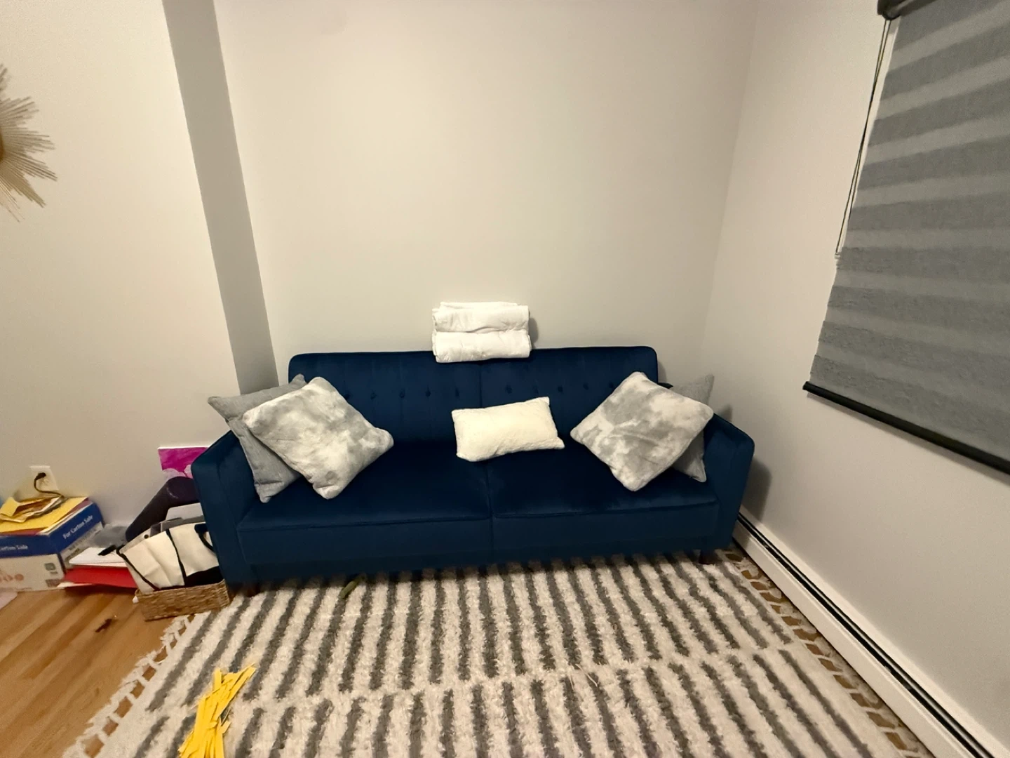 Comfortable blue velvet sofa with tufted detailing. It's upholstered in a soft velvet fabric. Comes with throw pillows. Perfect for a living room or apartment!