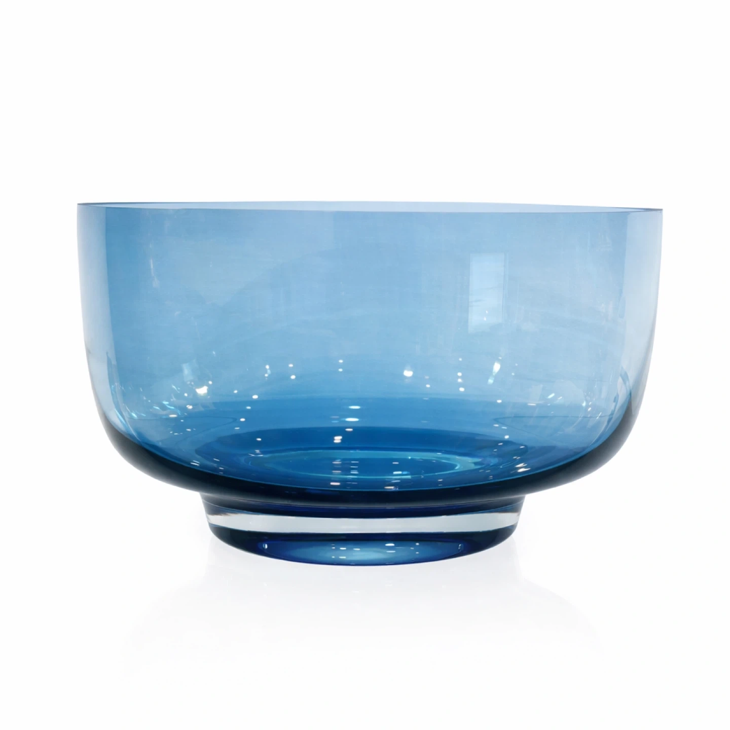 Offered is a substantial mid-20th-century blue art glass bowl, produced in thick pressed glass and distinguished by its refined proportions, exceptional weight, and luminous color. The bowl presents a broad, open mouth with gently flared walls, rising from a stepped circular foot that provides both visual lift and structural balance.