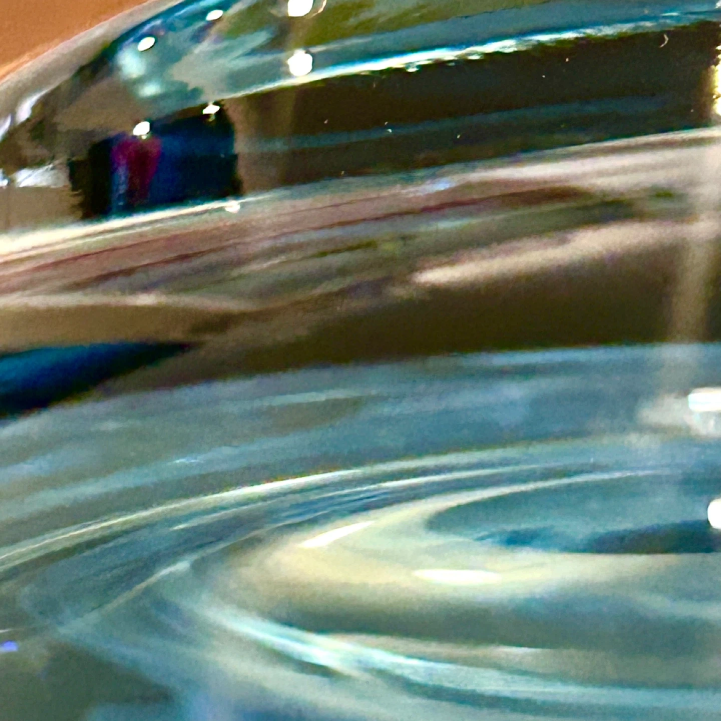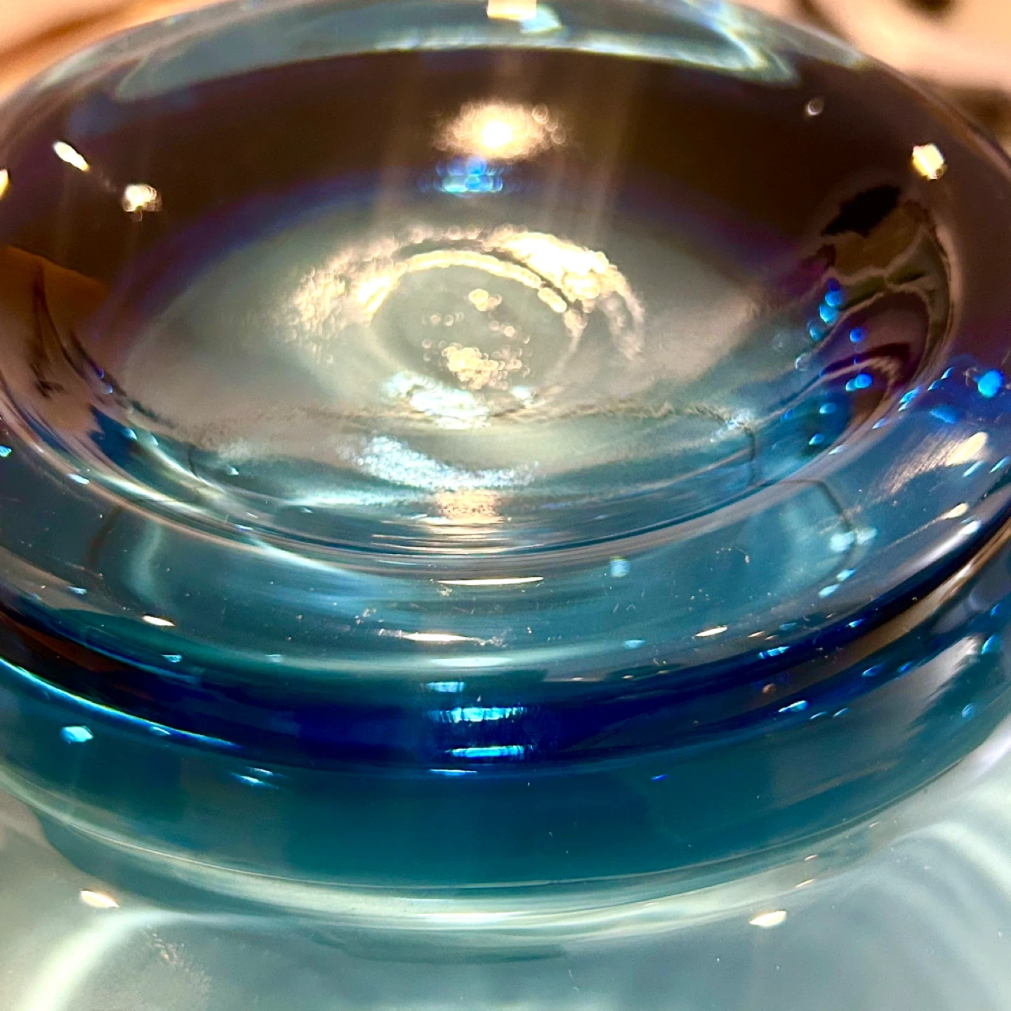 The glass displays a nuanced blue tonality, deepening toward the base and softening toward the rim. Close examination reveals controlled mold flow and clean pressing, confirming molded manufacture rather than free-blown production. The surface clarity is high, with uncontrolled air bubbles visible in macro views—an inherent feature of decorative glassmaking rather than a defect—adding depth and evidence of material movement during forming.