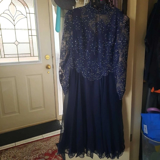 Long sleeve formal evening dress with lattice bodice sewn with pearls and diamonds. Size 14. Worn only once. Paid over $200. Like New.