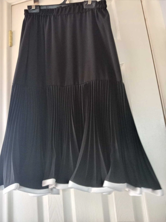 This is a stylish black skirt with pleated chiffon detailing and a white hem, perfect for adding a touch of elegance to any outfit. It's in good condition and ready for a new home! Colour: Black with white trim. Material: Chiffon. Style: Pleated. If the ad's up, it's still available! Cash accepted.