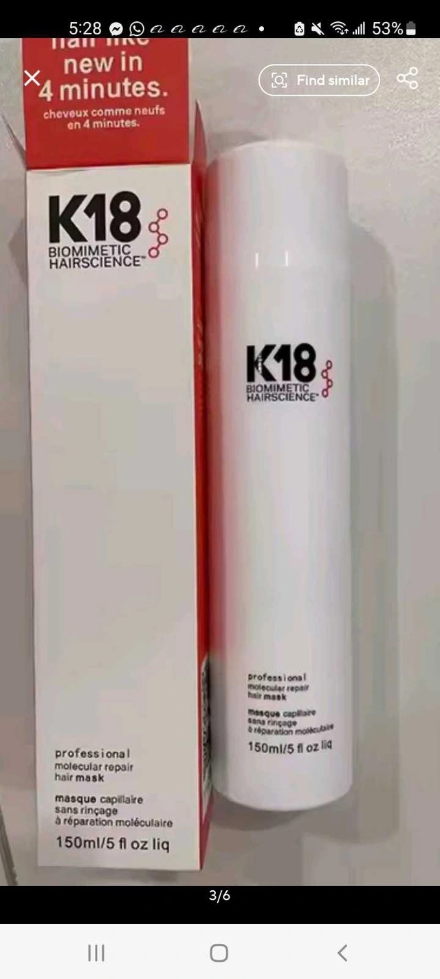 Achieve professional-level hair repair with this K18 Professional Molecular Repair Hair Mask, presented in a generous 150ml size. This mask is designed to rejuvenate and revitalize hair in just 4 minutes, restoring strength and elasticity. It is in new condition, complete with its original box. This bottle is a "brand" replica and a very good one. Have many positive results from other customers. Cash accepted: Yes. Cashless payment: Yes.