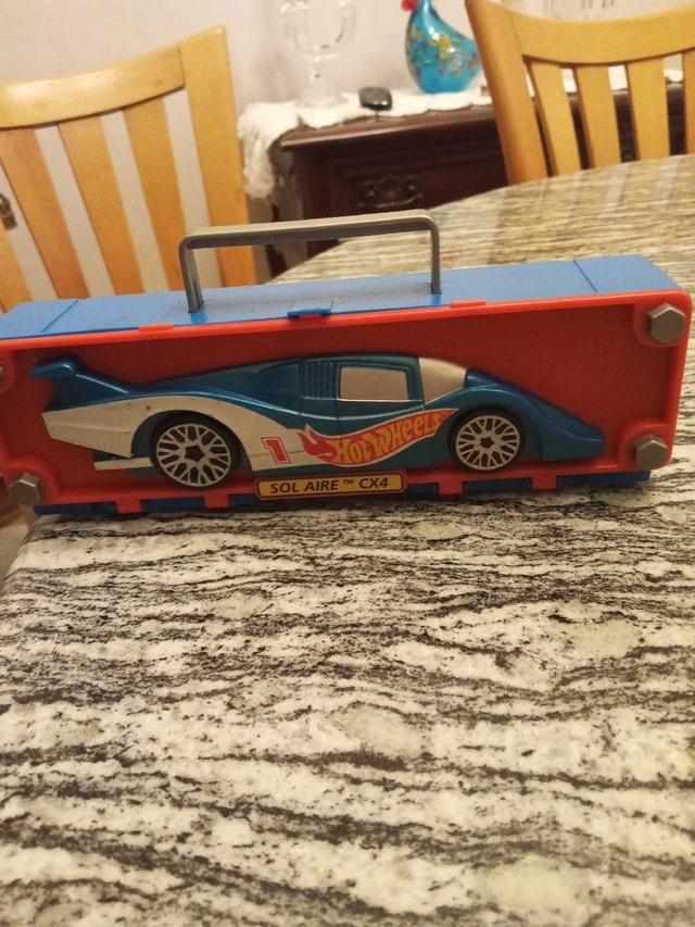 This is a used 1998 Hot Wheels Sol Aire CX4 car carrier. It's in good condition, ready to be filled with your cool collection. Its vibrant colors and classic design make it a standout vintage piece from Mattel.