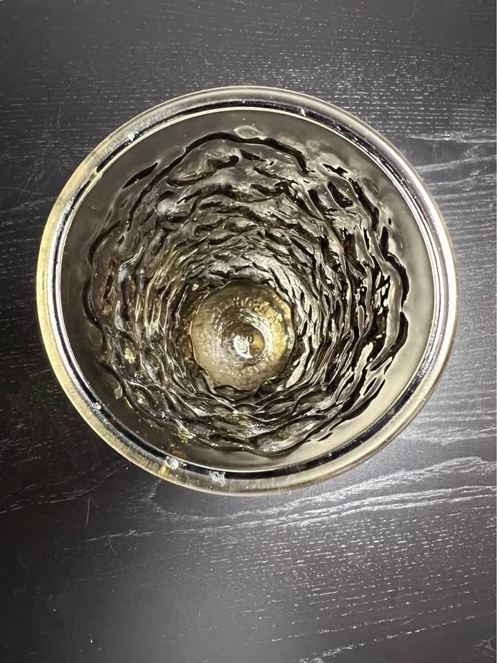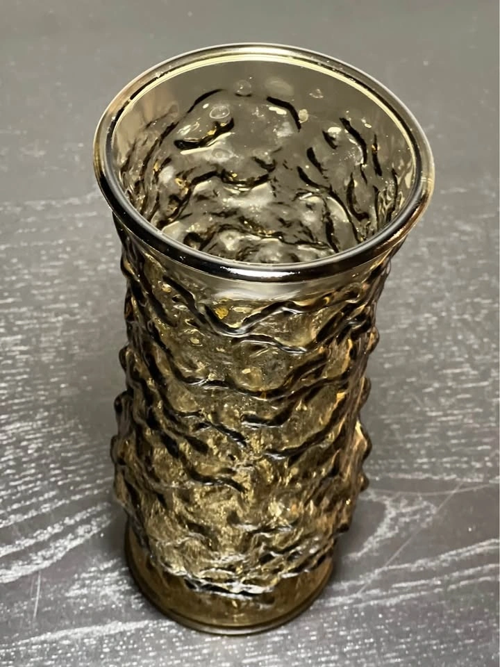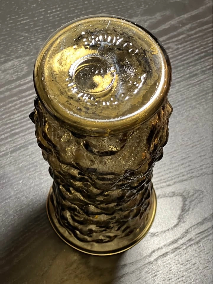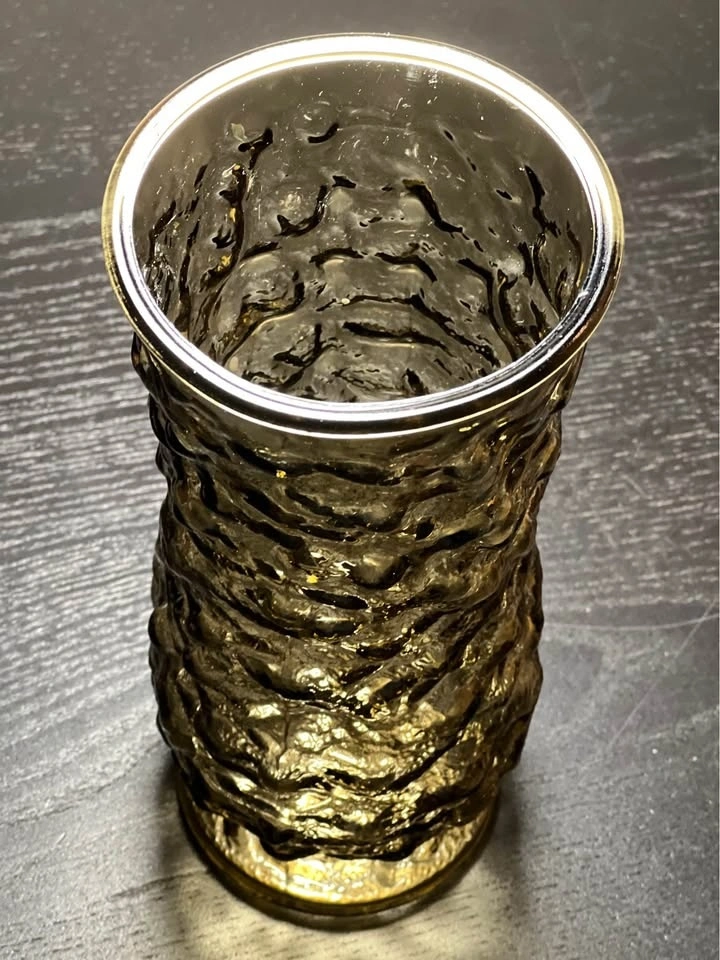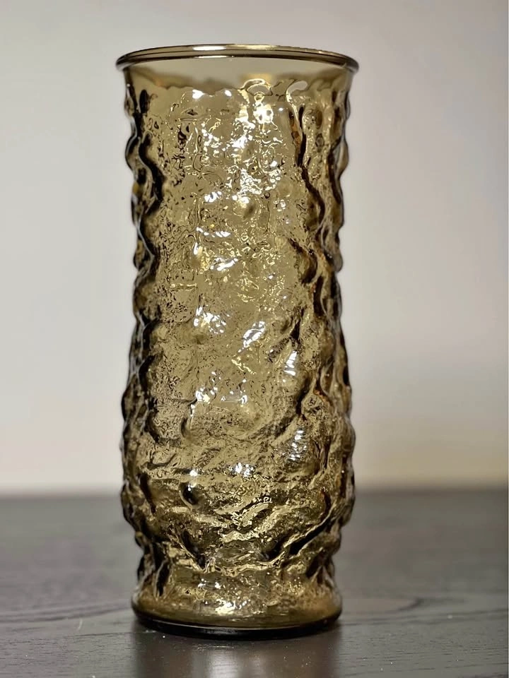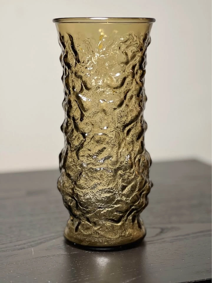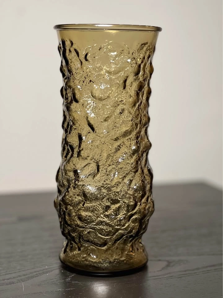 This is a vintage E.O. Brody Co. crinkle glass vase in a brown or "smoke" color, measuring approximately 8.5 inches tall. This style of mid-century modern glassware was produced in the United States, typically in the 1960s or 1970s. Preowned. Pickup is 58th and 7th Ave in midtown Manhattan.