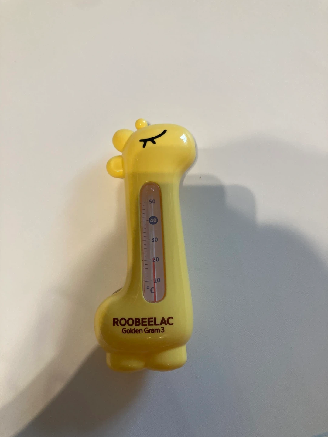 Yellow giraffe-shaped thermometer. It measures in Celsius with markings up to 50°C. It's in good condition.