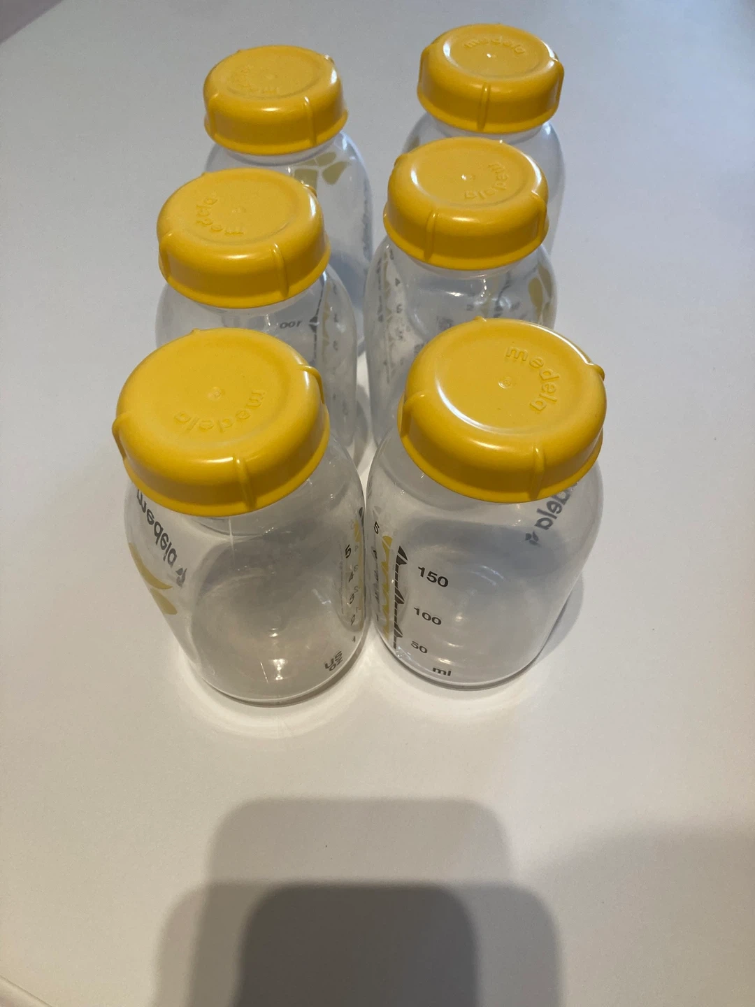 Set of six 6 oz Medela breast milk storage bottles. Features clear markings in ml and US oz. Yellow screw-on caps included. Great for storing pumped milk!