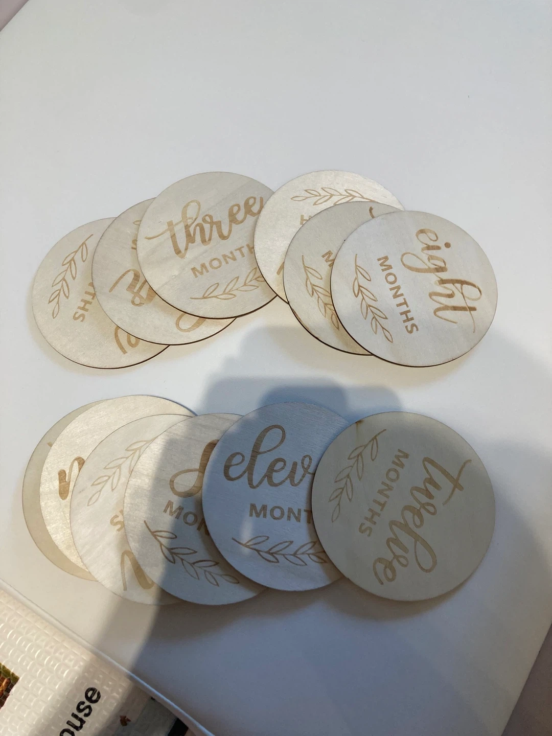 A set of wooden discs for marking baby's monthly milestones. They're inscribed with numbers one through twelve. Perfect for capturing your baby's growth. Natural wood material.