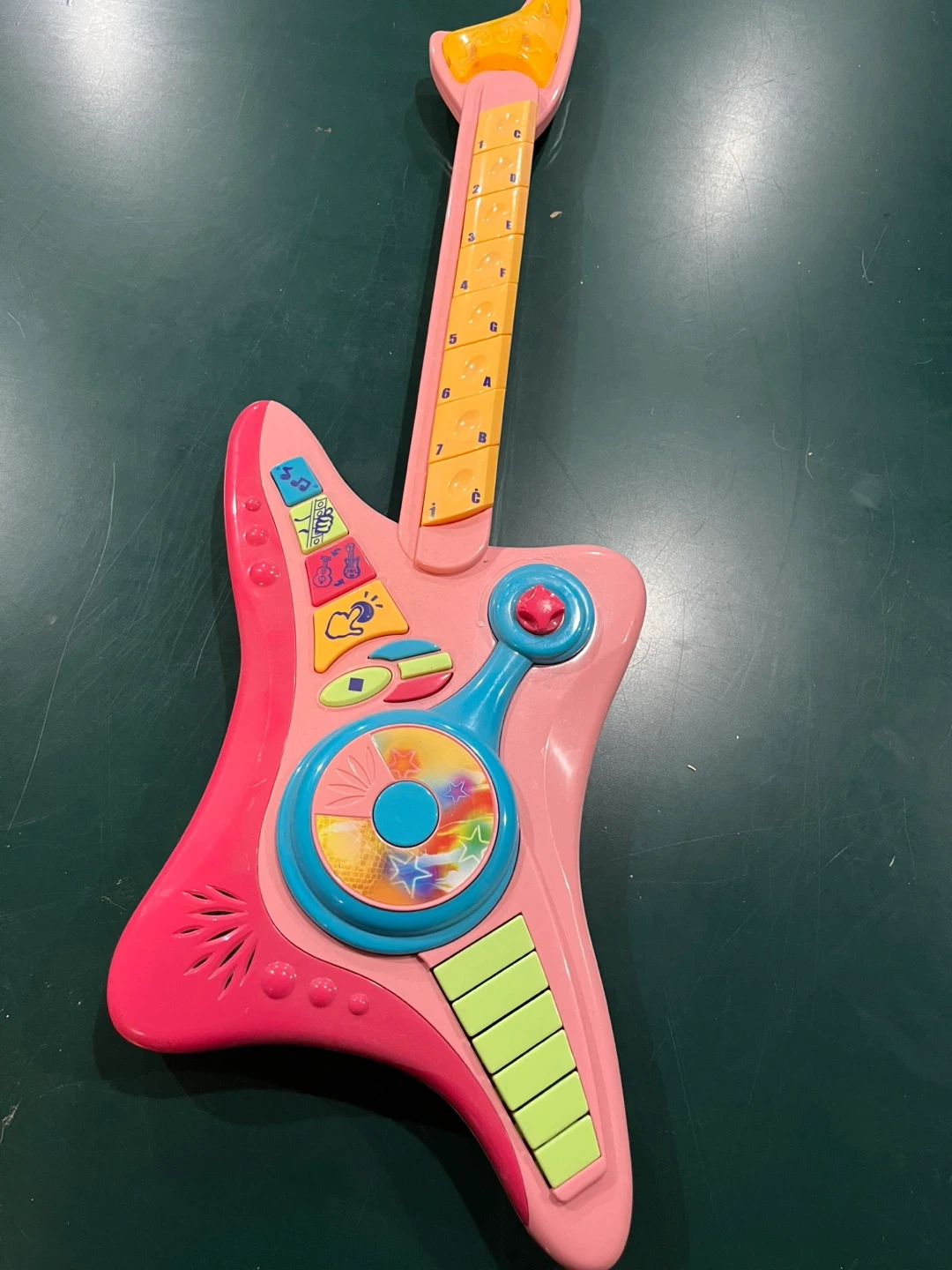 This is a fun pink toy guitar for little ones. It has several colourful buttons that make different sounds and musical effects. Great for sparking a child's interest in music!