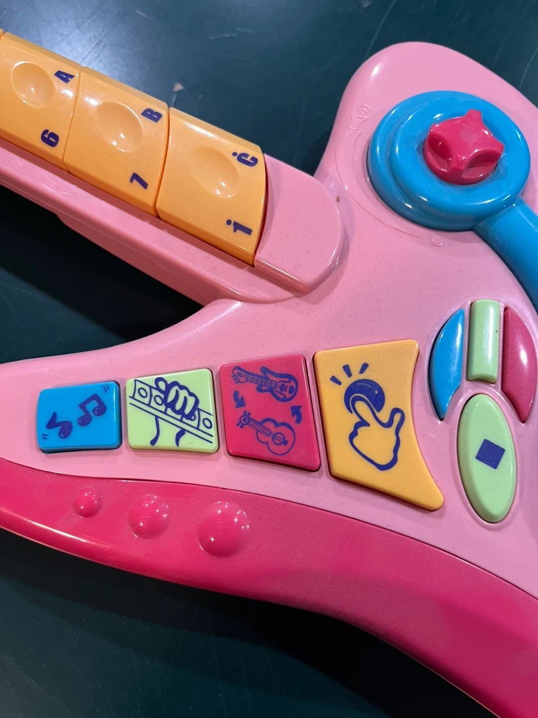 This is a fun pink toy guitar for little ones. It has several colourful buttons that make different sounds and musical effects. Great for sparking a child's interest in music!