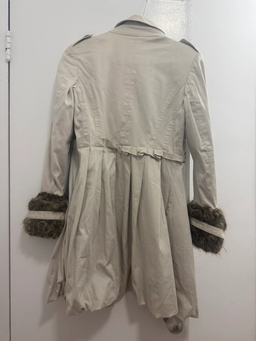 Chic double-breasted trench coat from Basement Collection in a light beige color. Features stylish pleating at the hem and detachable faux fur cuffs. Size 40. It's a great piece for cooler weather!