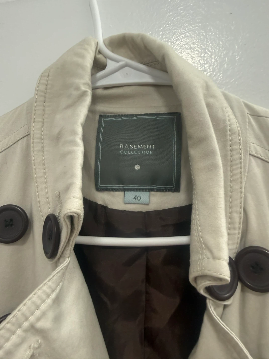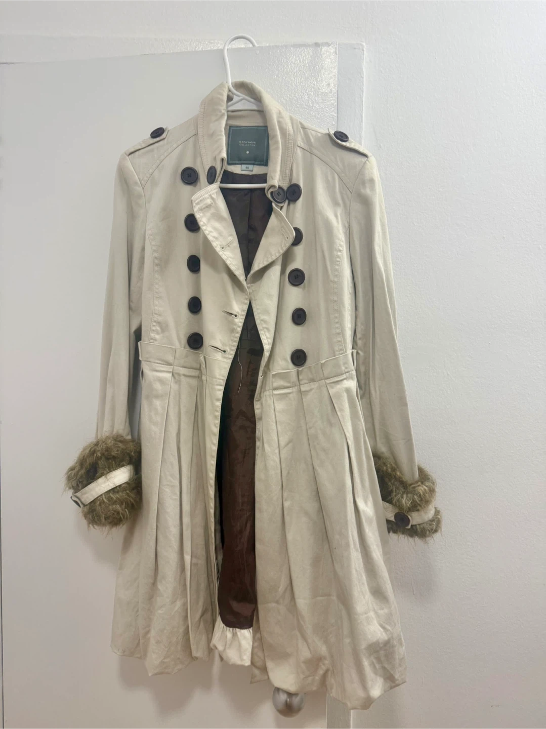 Chic double-breasted trench coat from Basement Collection in a light beige color. Features stylish pleating at the hem and detachable faux fur cuffs. Size 40. It's a great piece for cooler weather!