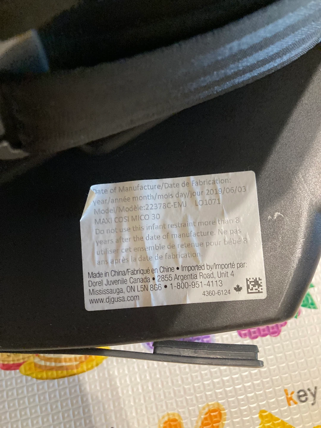 This is a Maxi-Cosi Mico 30 infant car seat base. It was manufactured on June 3, 2019. The base is included. It's compatible with the Mico 30 infant car seat.