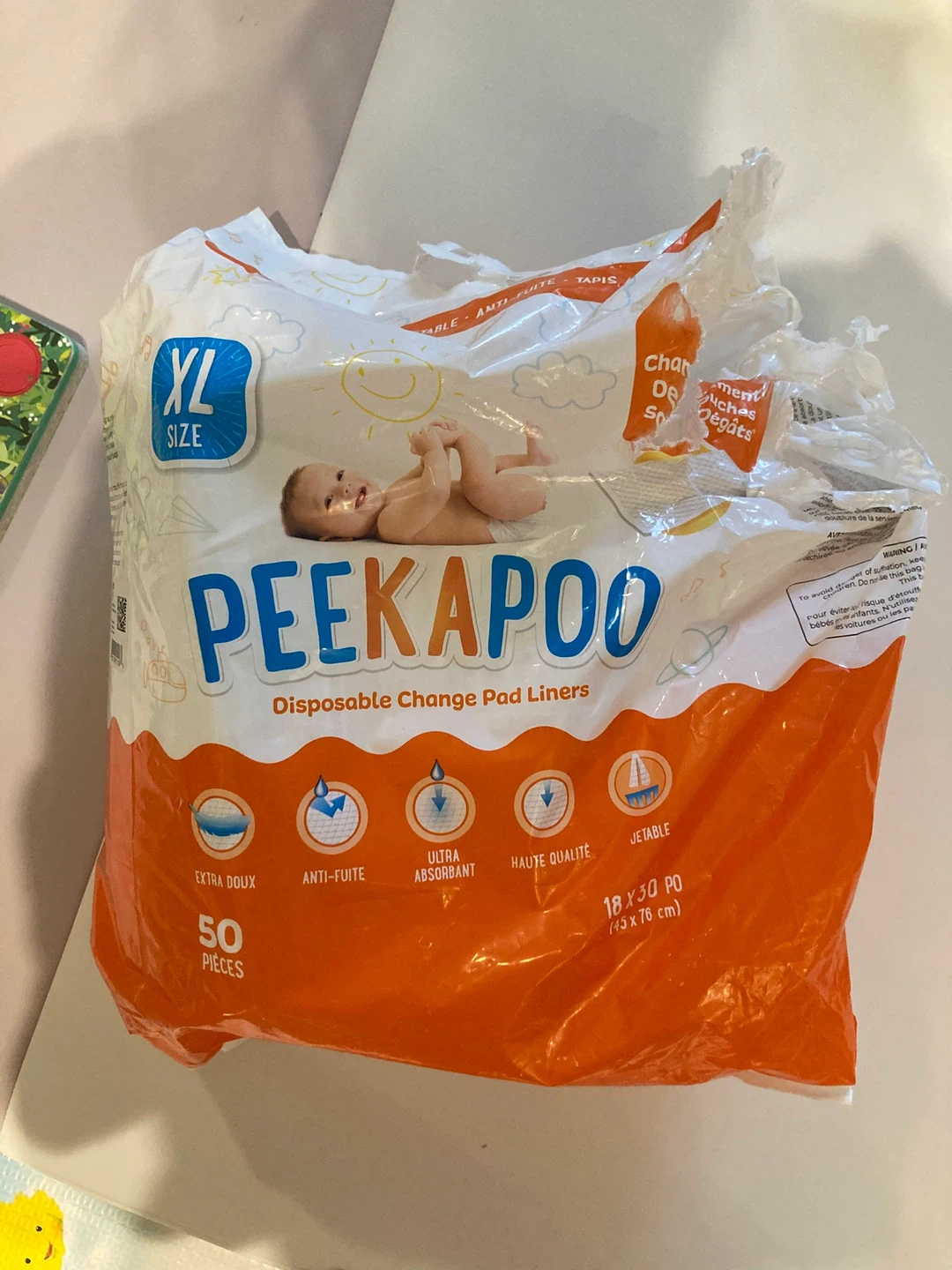 These Peekapoo disposable change pad liners are XL size and 15 pieces. They are extra soft, leak-proof, ultra-absorbent, and high quality. Each liner measures 18 x 30 inches (45 x 76 cm). They're great for on-the-go changes!