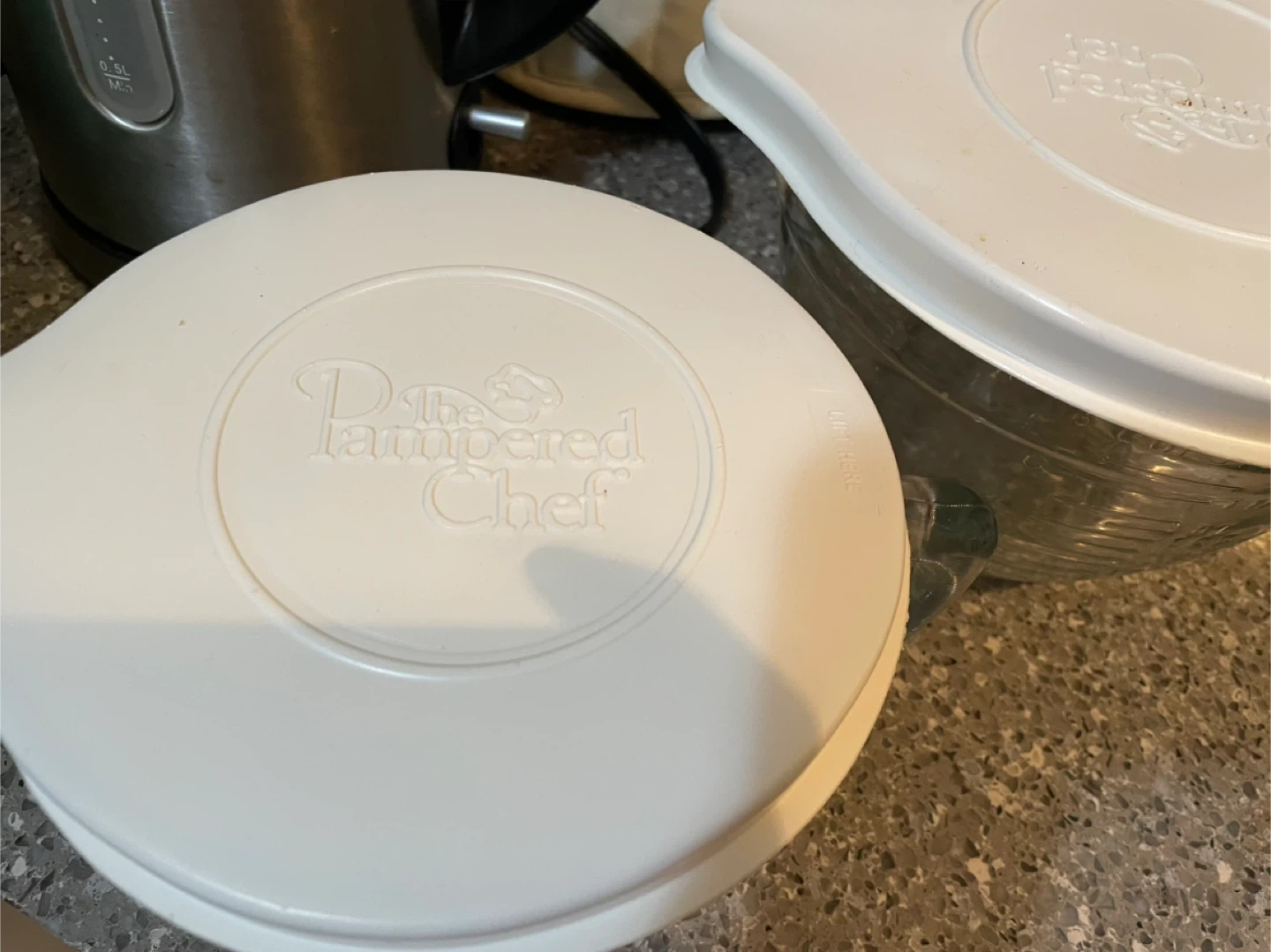 These are two glass mixing bowls from The Pampered Chef. They come with white lids. The larger bowl measures 8 cups/2 quarts and the smaller bowl measures 4 cups/1 quart. Great for mixing ingredients!