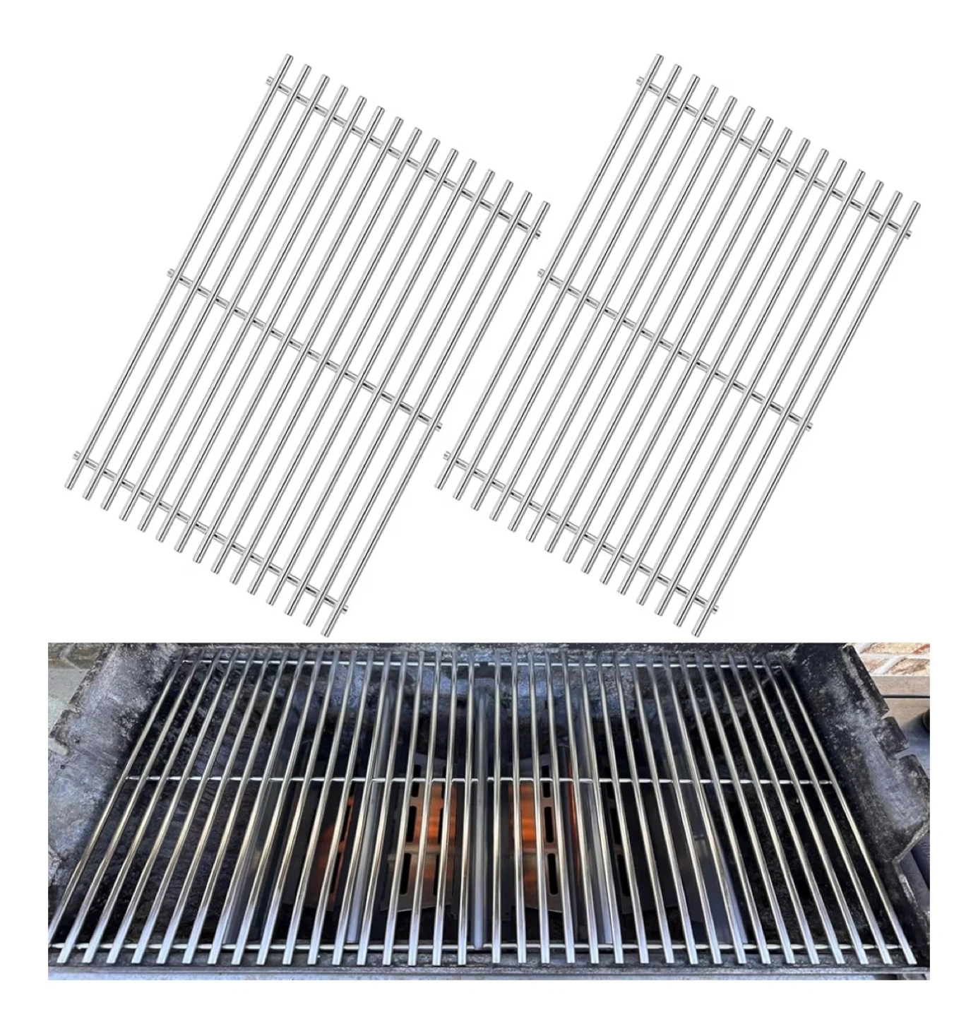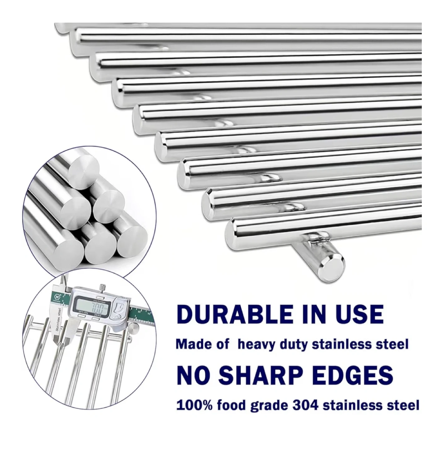 Set of two heavy-duty stainless steel grill grates. They measure 19.5" x 12.9" with 10mm gaps, ensuring small items won't fall through. Made of durable, food-grade 304 stainless steel with no sharp edges.