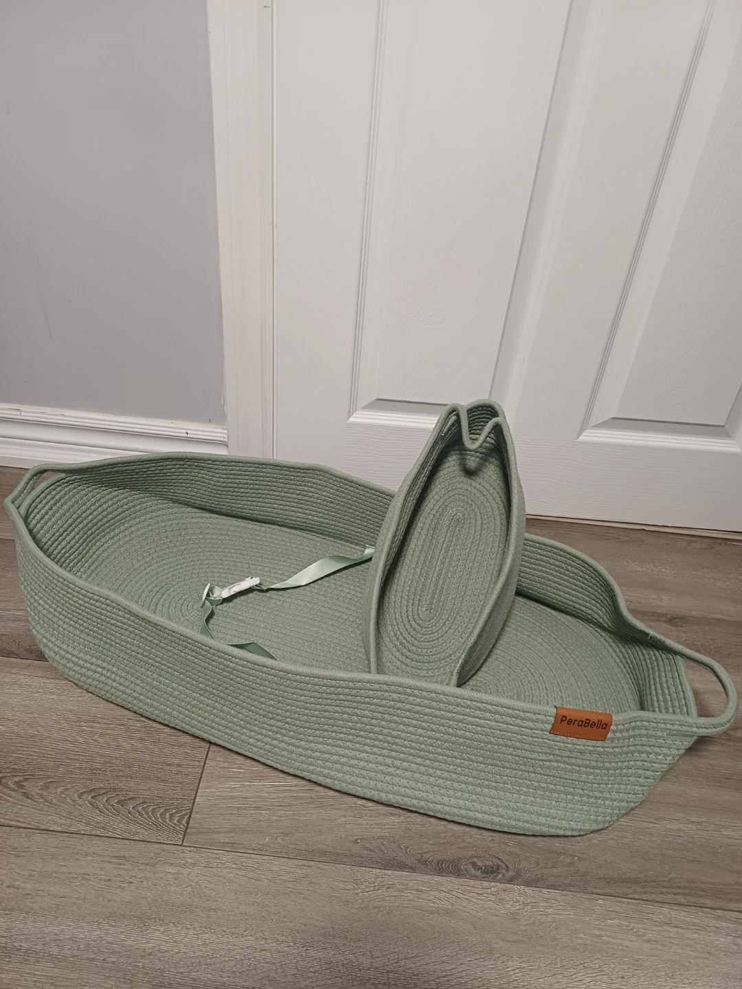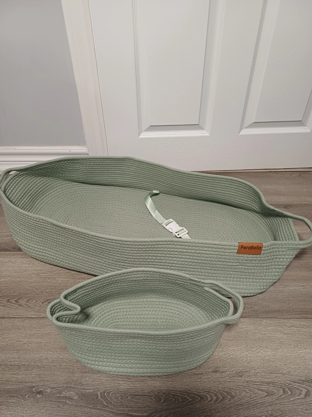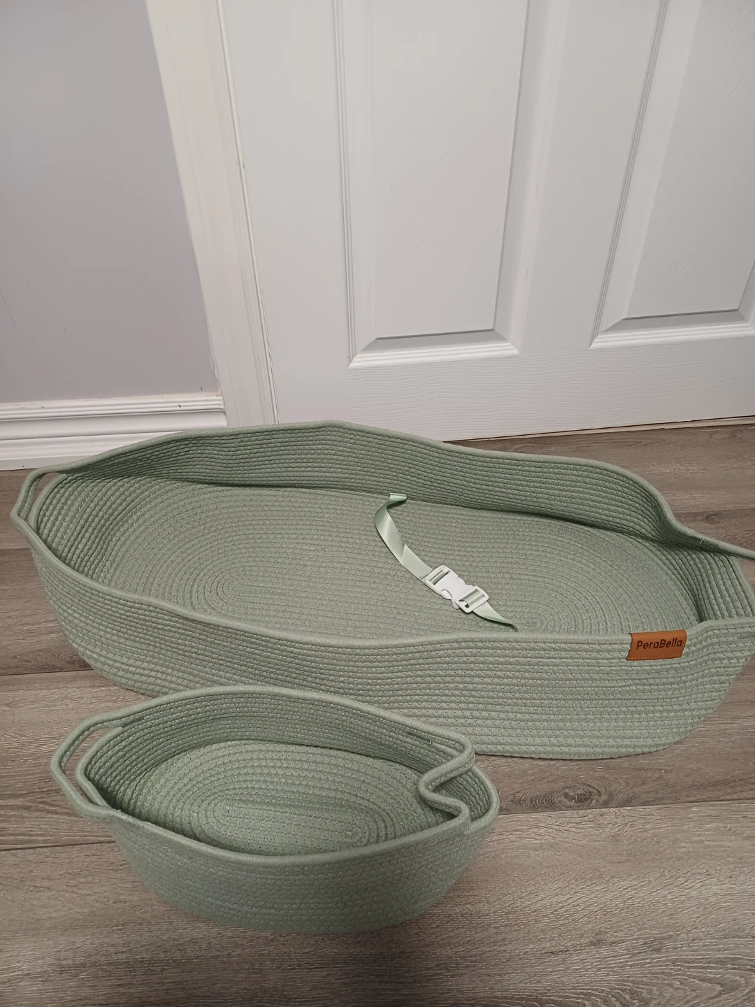 This is a brand new... PeraBella rope bassinet with a matching basket. It's made from a soft, woven rope material in a calming sage green colour. Includes a safety buckle for the bassinet. This set is perfect for organizing baby essentials or creating a cozy sleeping space.