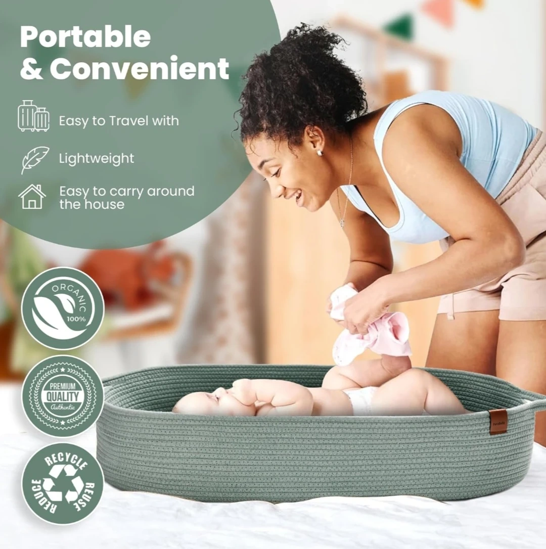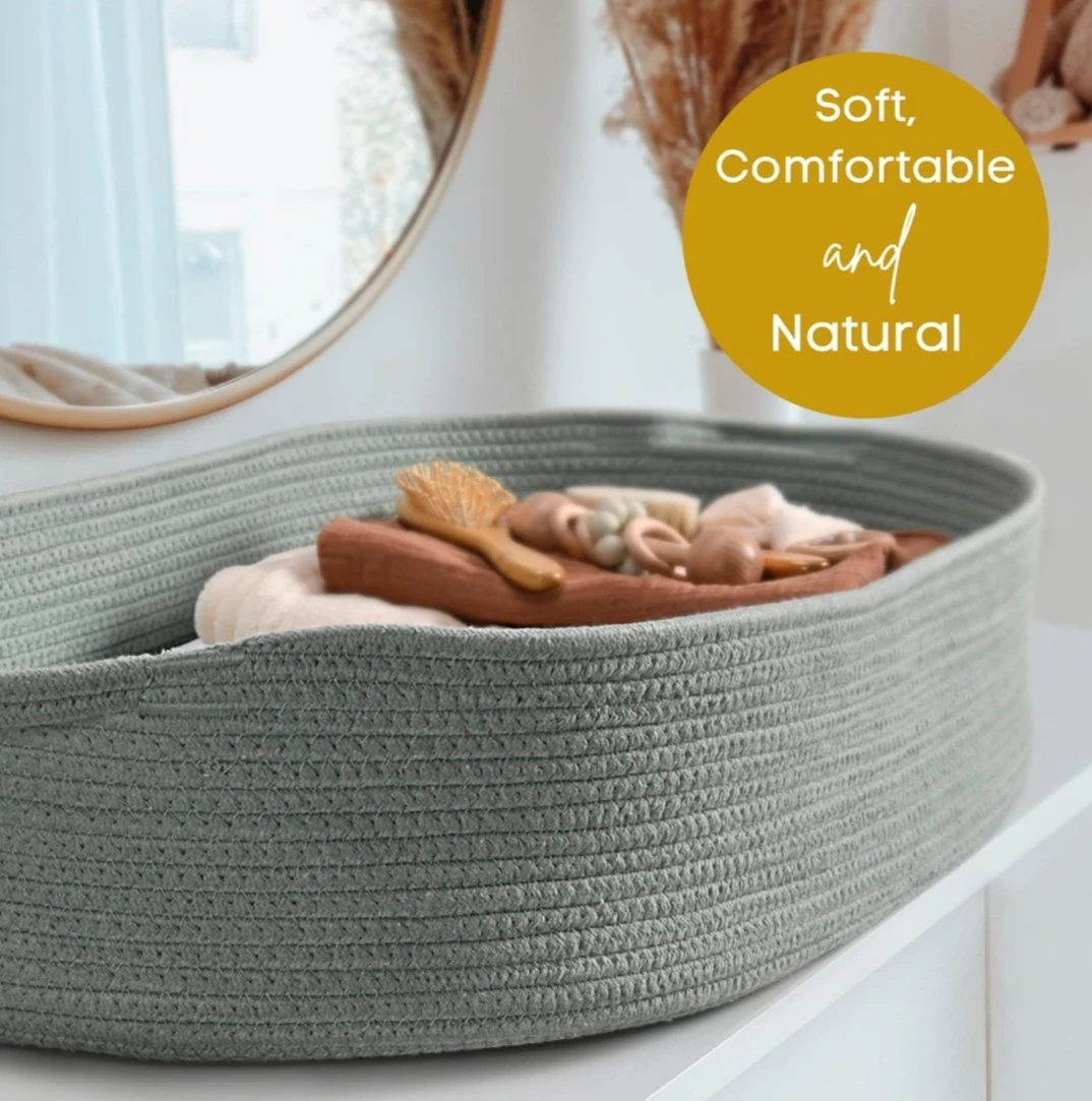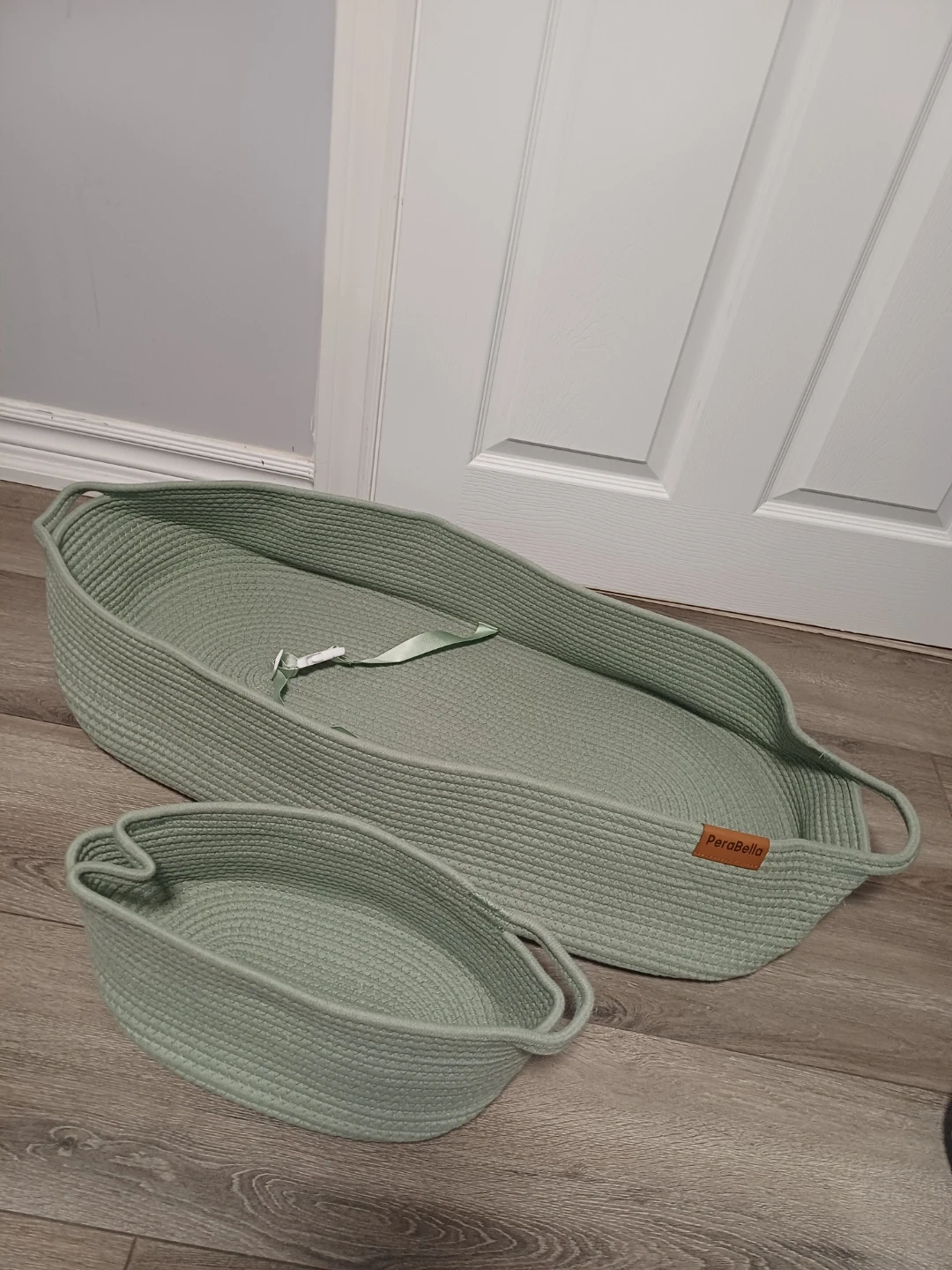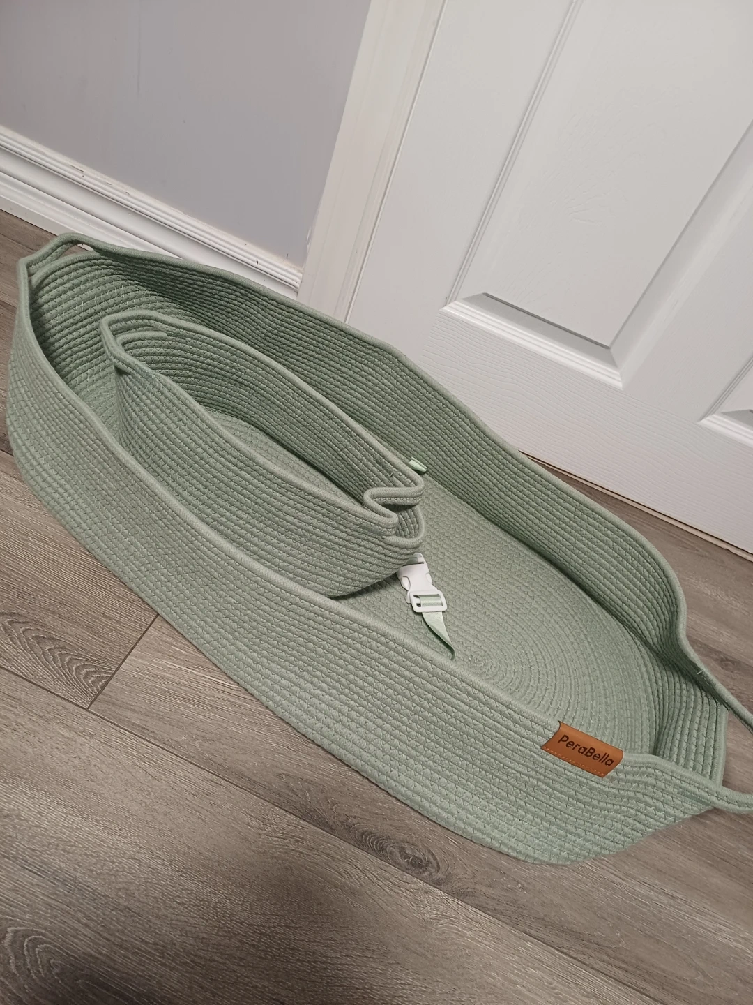 This is a brand new... PeraBella rope bassinet with a matching basket. It's made from a soft, woven rope material in a calming sage green colour. Includes a safety buckle for the bassinet. This set is perfect for organizing baby essentials or creating a cozy sleeping space.