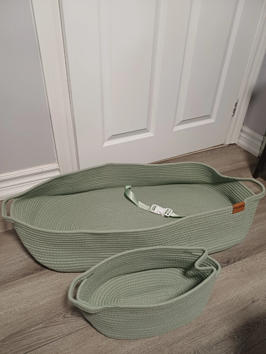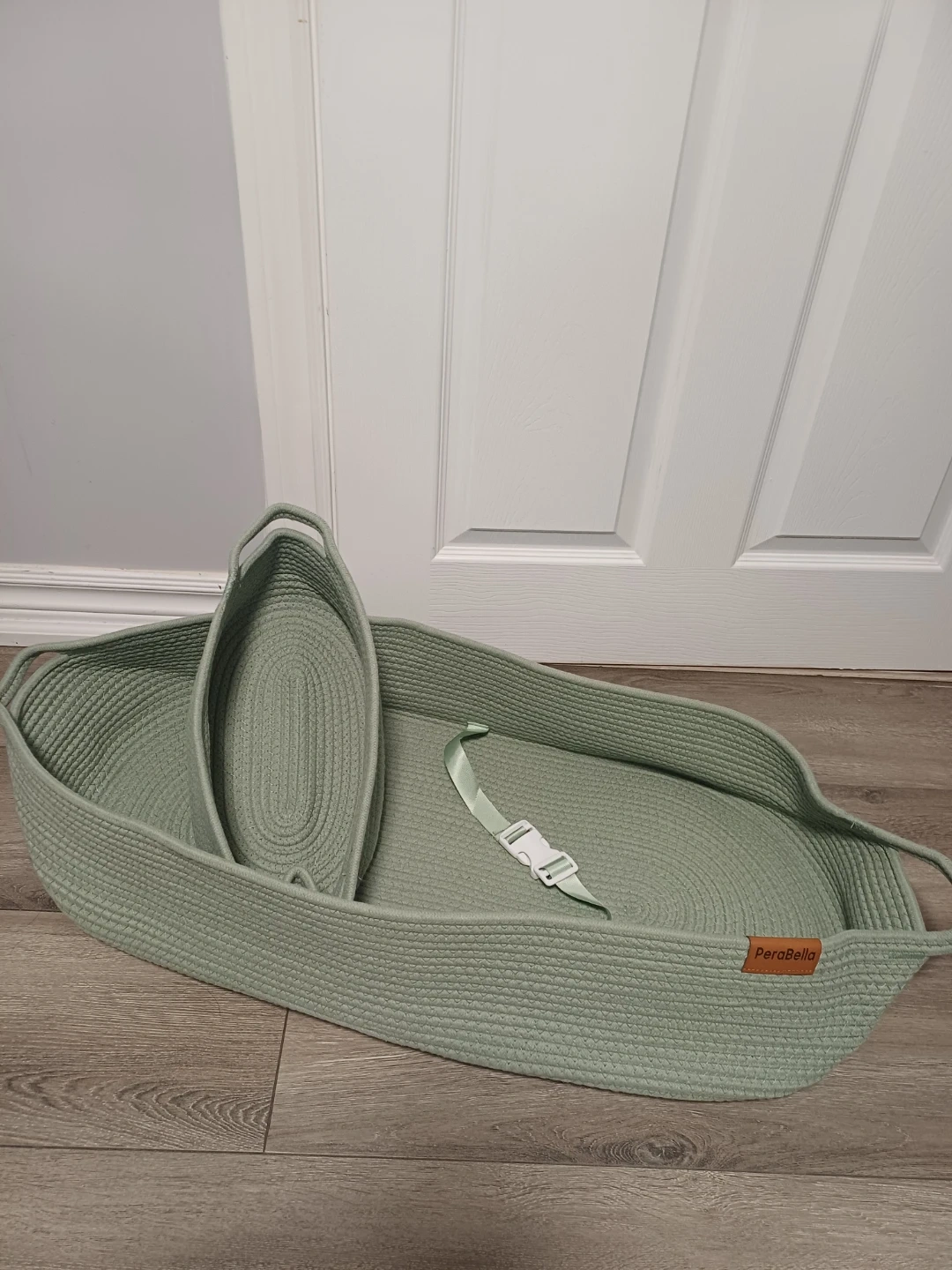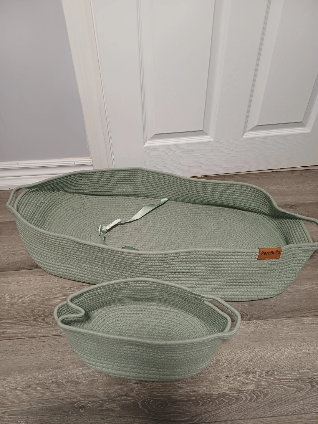 This is a brand new... PeraBella rope bassinet with a matching basket. It's made from a soft, woven rope material in a calming sage green colour. Includes a safety buckle for the bassinet. This set is perfect for organizing baby essentials or creating a cozy sleeping space.