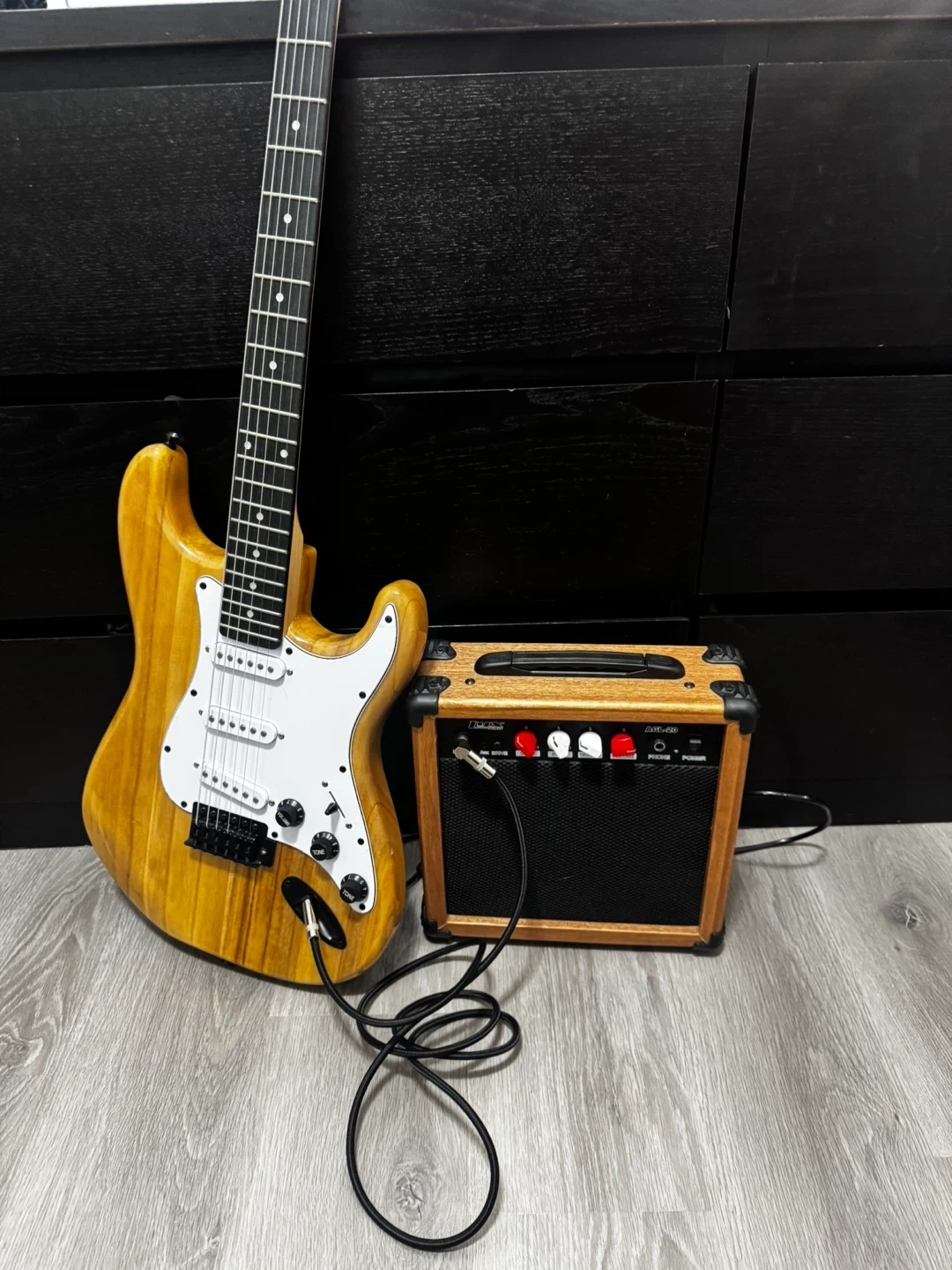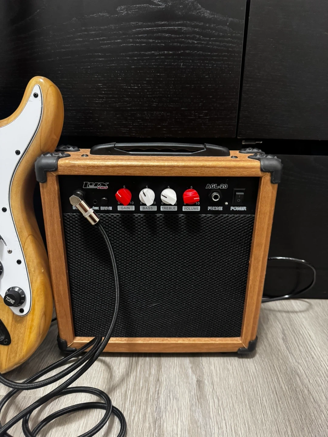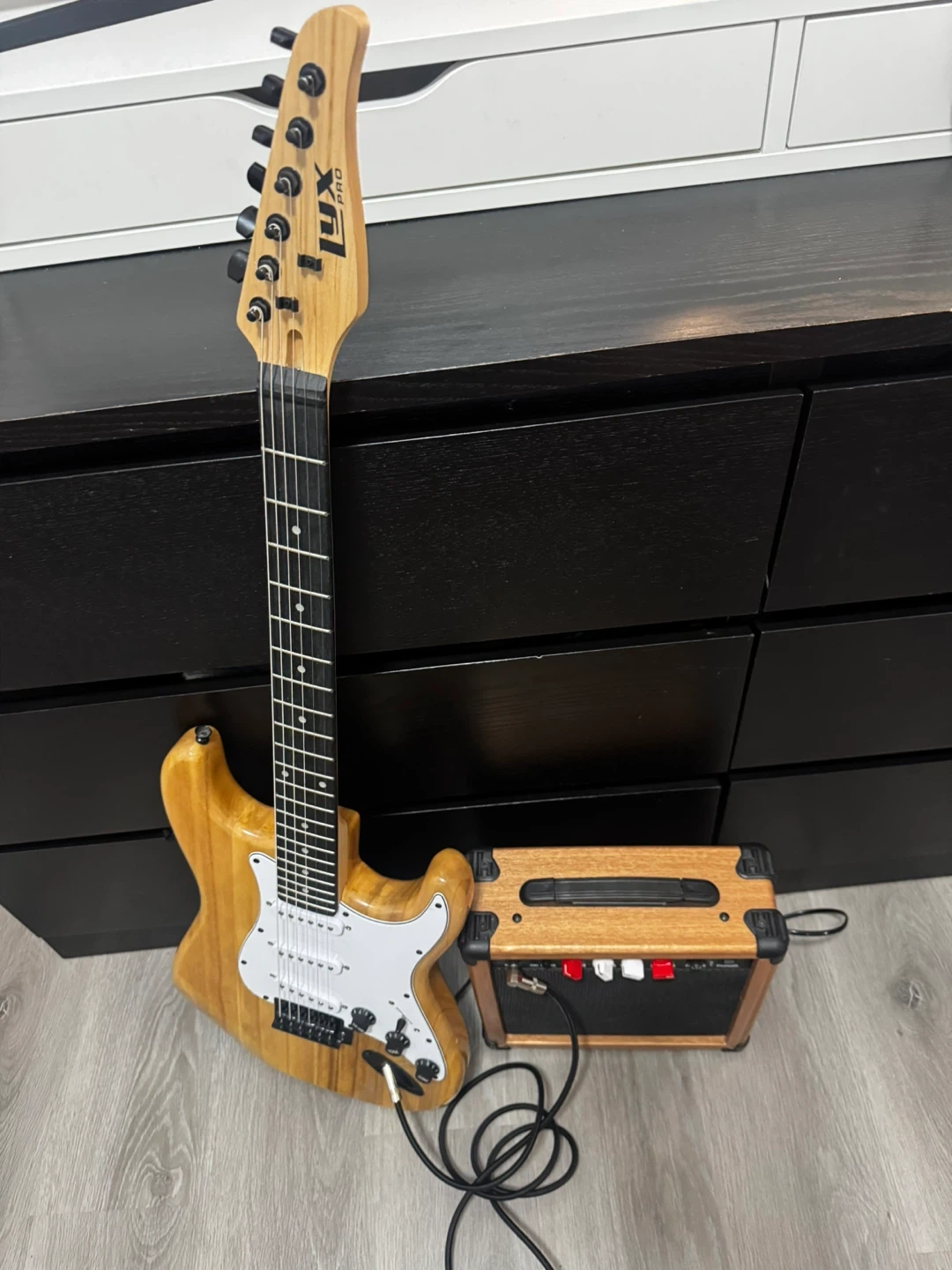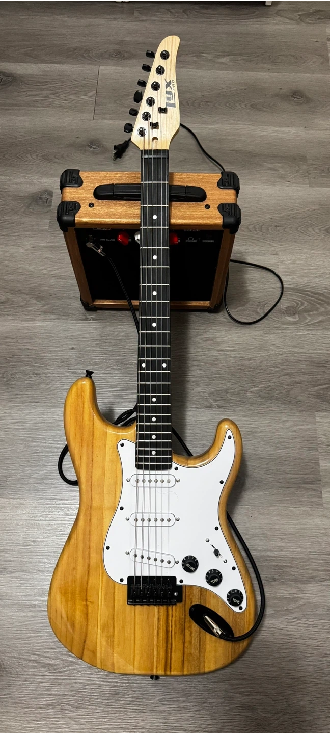 This is a LYX PRO electric guitar bundled with a portable AGL-20 amplifier. The guitar has a natural wood finish and a white pickguard. The amp features controls for gain, drive, bass, treble, and volume. Perfect for beginner guitarists or for practising at home!